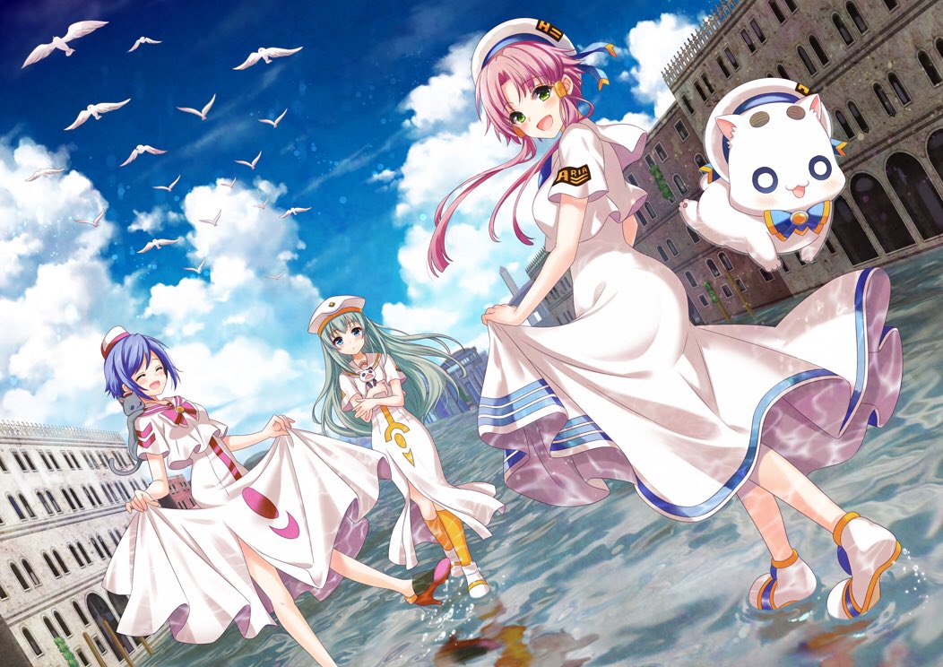 3girls aika_granzchesta alice_carroll animal animal_on_shoulder aria_(manga) aria_pokoteng azuki_yui beret bird blue_bow blue_bowtie blue_eyes bow bowtie building cat cat_on_shoulder closed_eyes clothes_lift cloud copyright_name dress dress_lift flock flood green_eyes grey_cat hair_tubes hat high_heels hime_granzchesta holding holding_animal long_hair mizunashi_akari multiple_girls open_mouth pink_bow pink_bowtie pink_hair president_maa sailor_collar short_hair sky smile socks walking walking_on_liquid water white_dress white_footwear white_headwear white_sailor_collar yellow_socks