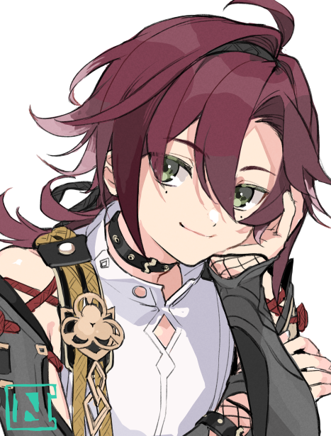 1boy armor black_choker choco_c14 choker closed_mouth genshin_impact green_eyes hair_between_eyes head_rest japanese_armor kote kurokote long_hair looking_at_viewer male_focus mole mole_under_each_eye mole_under_eye multiple_moles ponytail red_hair shikanoin_heizou signature simple_background solo upper_body white_background