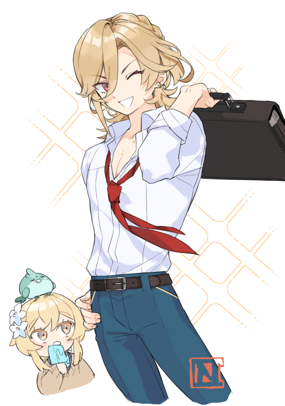 1boy 1girl alternate_costume animal animal_on_head animalization bird bird_on_head blonde_hair choco_c14 collared_shirt flower food genshin_impact hair_between_eyes hair_flower hair_ornament hand_on_own_hip holding kaveh_(genshin_impact) long_sleeves looking_at_viewer lumine_(genshin_impact) necktie on_head one_eye_closed pants popsicle red_eyes red_necktie shirt simple_background sparkle white_background white_flower white_shirt xiao_(bird)_(genshin_impact) xiao_(genshin_impact)