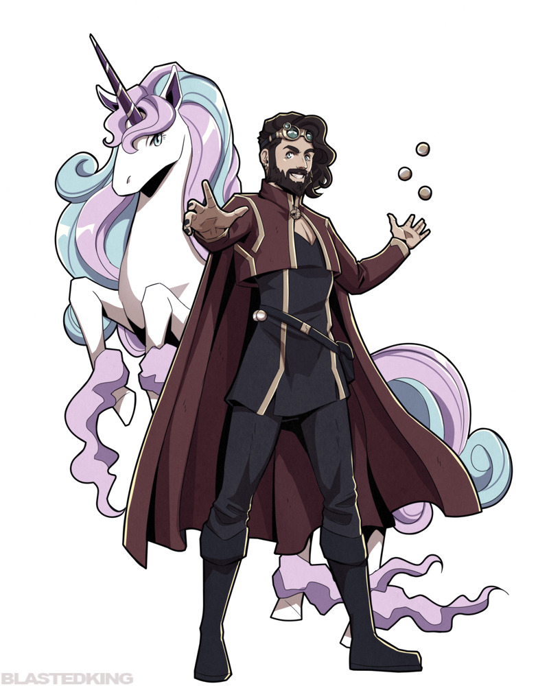 1boy arms_up artist_name beard black_nails black_pants black_shirt blastedking brown_hair cape crossover facial_hair galarian_form galarian_rapidash gen_1_pokemon gen_8_pokemon gloryhammer goggles goggles_on_head high_collar looking_at_viewer medium_hair mustache nintendo orb pants pokemon pokemon_(creature) rapidash red_cape shirt smile unicorn white_background zargothrax