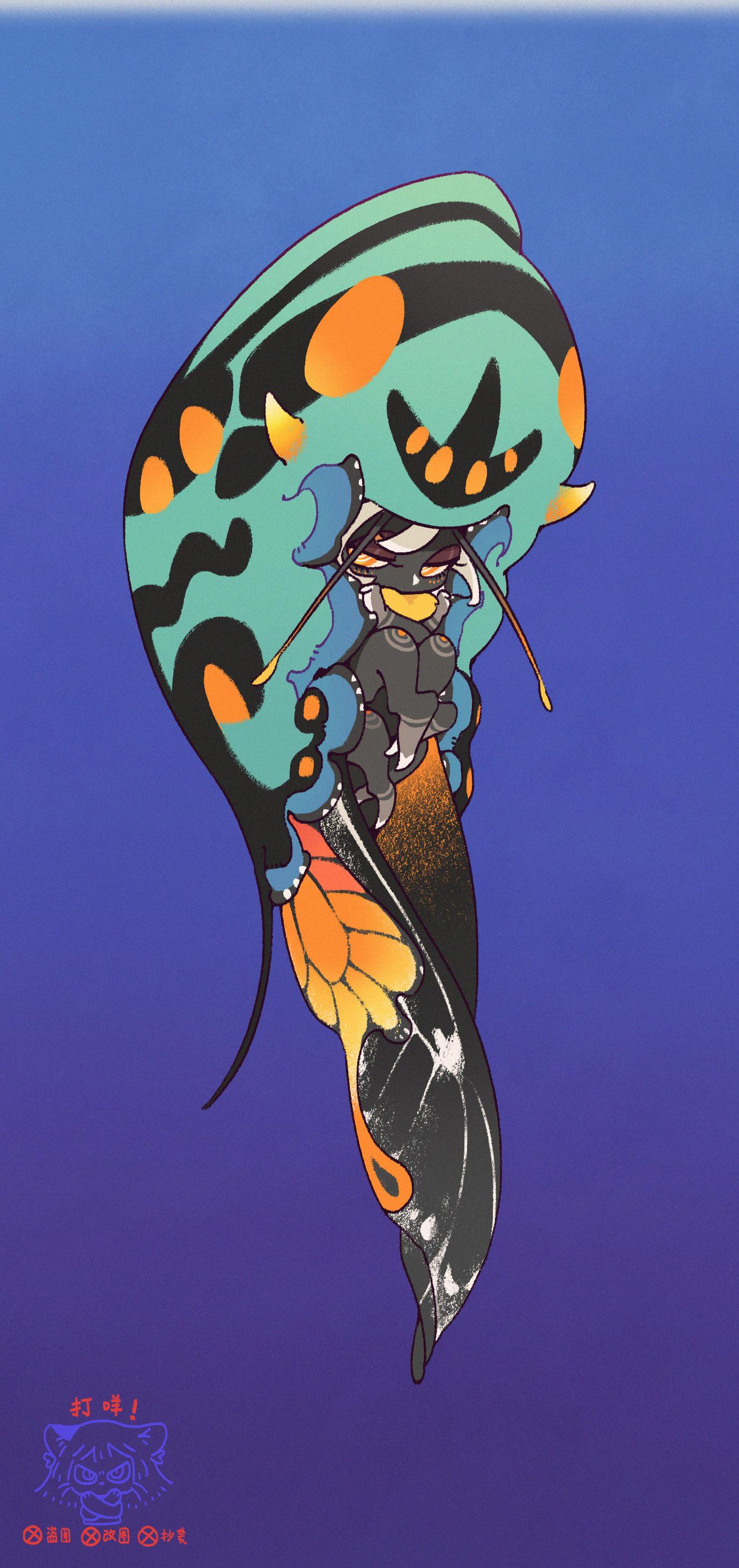 1other absurdres antennae black_skin blue_background bug butterfly chrysalis_(butterfly) colored_skin full_body furry gradient_background highres hua_hua_de_meme insect larva orange_wings original solo watermark wings yellow_eyes