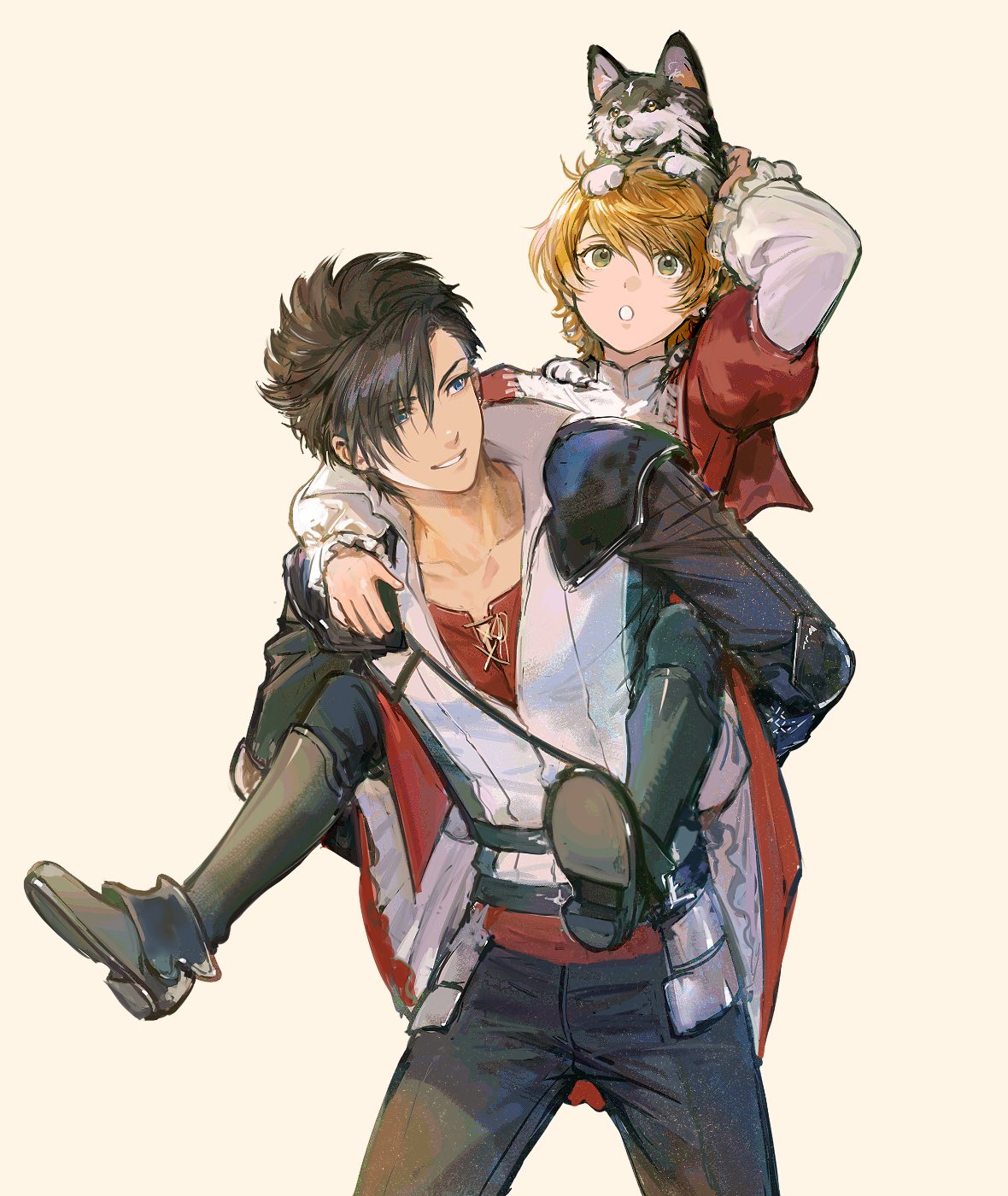 2boys animal arm_up armor baby_animal black_eyes black_footwear black_hair black_jacket black_pants blue_eyes boots brothers carrying clive_rosfield collarbone cowboy_shot creisoa dog final_fantasy final_fantasy_xvi full_body grey_background highres jacket joshua_rosfield male_focus multiple_boys orange_hair pants piggyback puppy red_shirt shirt short_hair shoulder_armor siblings simple_background smile standing torgal_(ff16) vest white_vest