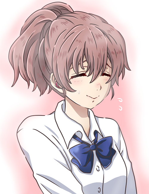 1girl blue_bow blue_bowtie bow bowtie brown_hair closed_eyes closed_mouth collared_shirt flying_sweatdrops hearing_aid koe_no_katachi long_hair momo_usagi nishimiya_shouko ponytail school_uniform shirt smile solo upper_body white_background white_shirt