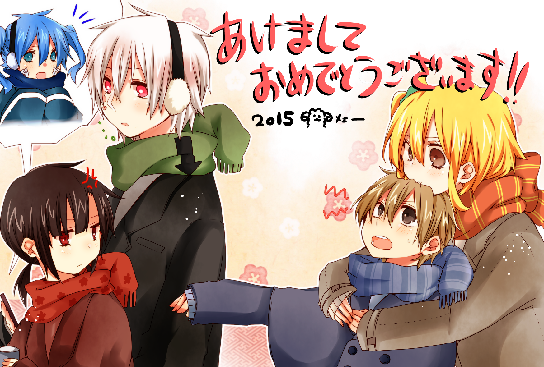 2015 2boys 3girls age_difference akeome alternate_costume amamiya_hibiya anger_vein aoi_choko_(aoichoco) aqua_scrunchie arrow_(symbol) arrow_print asahina_hiyori black_coat black_eyes black_hair blue_coat blue_eyes blue_hair blue_jacket blue_scarf blue_sweater breast_pocket bright_pupils buttons cherry_blossoms closed_mouth coat commentary_request cropped_torso double-breasted double-parted_bangs earmuffs ene_(kagerou_project) facial_mark flower gradient_background grey_coat grey_scarf grey_sweater hair_between_eyes hair_ornament hair_scrunchie happy_new_year headphones height_difference highres holding jacket kagerou_project kisaragi_momo konoha_(kagerou_project) lapels light_brown_hair light_frown long_sleeves looking_at_another looking_back looking_up low_twintails multiple_boys multiple_girls new_year notched_lapels notice_lines open_mouth orange_hair orange_scarf parted_lips pink_background pink_eyes pink_flower pocket print_scarf reaching red_coat red_eyes red_scarf scarf scrunchie sheep short_hair side_ponytail single_stripe sleeves_past_fingers sleeves_past_wrists sound_effects spoken_character star_(symbol) star_print striped_clothes striped_scarf sweater teeth track_jacket translated turning_head twintails two-tone_scarf upper_body upper_teeth_only vertical-striped_clothes vertical-striped_scarf white_background white_hair white_pupils winter_clothes yellow_scarf