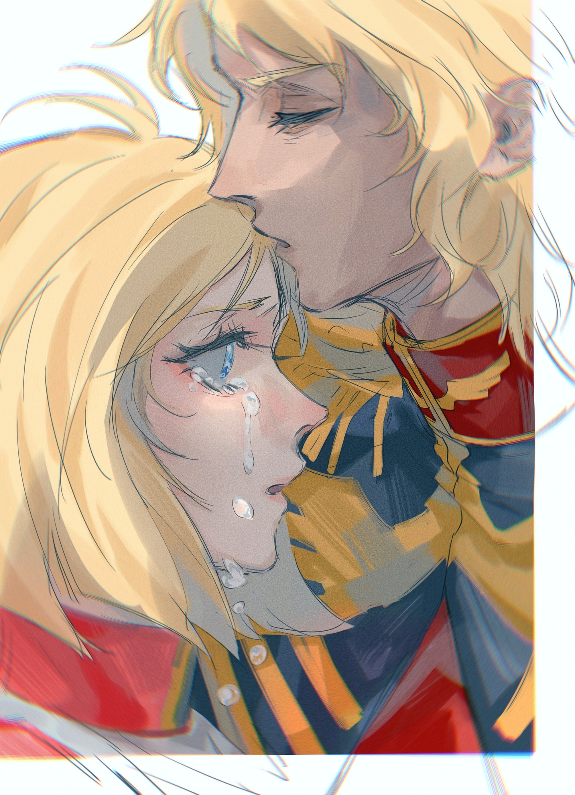 1boy 1girl absurdres blonde_hair blue_eyes brother_and_sister char_aznable chinese_commentary chromatic_aberration closed_eyes crying crying_with_eyes_open epaulettes film_grain from_side gundam hetero high_collar highres kiss kissing_forehead medium_hair military_uniform mobile_suit mobile_suit_gundam parted_lips samidaref_m sayla_mass siblings simple_background streaming_tears tears white_background