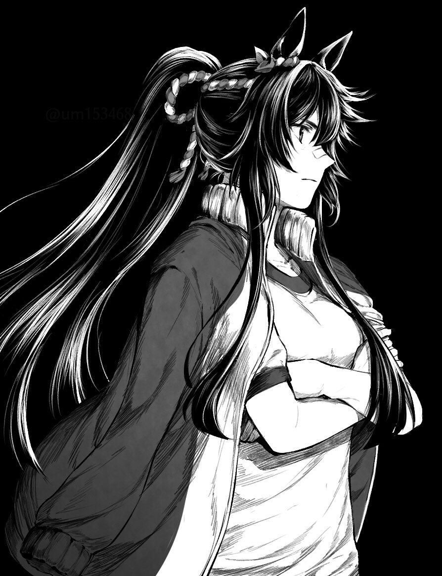 1girl animal_ears aoi_(aoi306) bandaid bandaid_on_face bandaid_on_nose breasts closed_mouth crossed_arms frown gym_uniform high_ponytail horse_ears jacket jacket_on_shoulders long_hair narita_brian_(umamusume) open_clothes open_jacket ponytail rope shimenawa shirt short_sleeves small_breasts solo umamusume upper_body