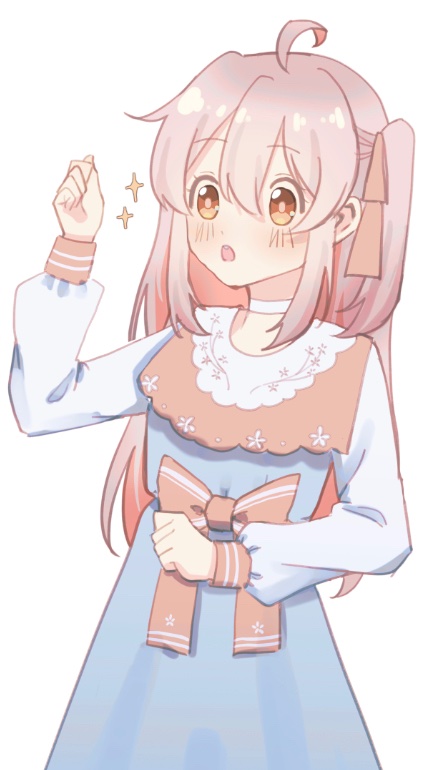 1girl :o ahoge alternate_costume blue_dress brown_eyes choker commentary dress genderswap genderswap_(mtf) hair_between_eyes hair_ribbon lazy_boneowo light_blush long_hair long_sleeves one_side_up onii-chan_wa_oshimai! open_mouth oyama_mahiro pink_hair puffy_long_sleeves puffy_sleeves red_ribbon ribbon simple_background solo sparkle white_background white_choker