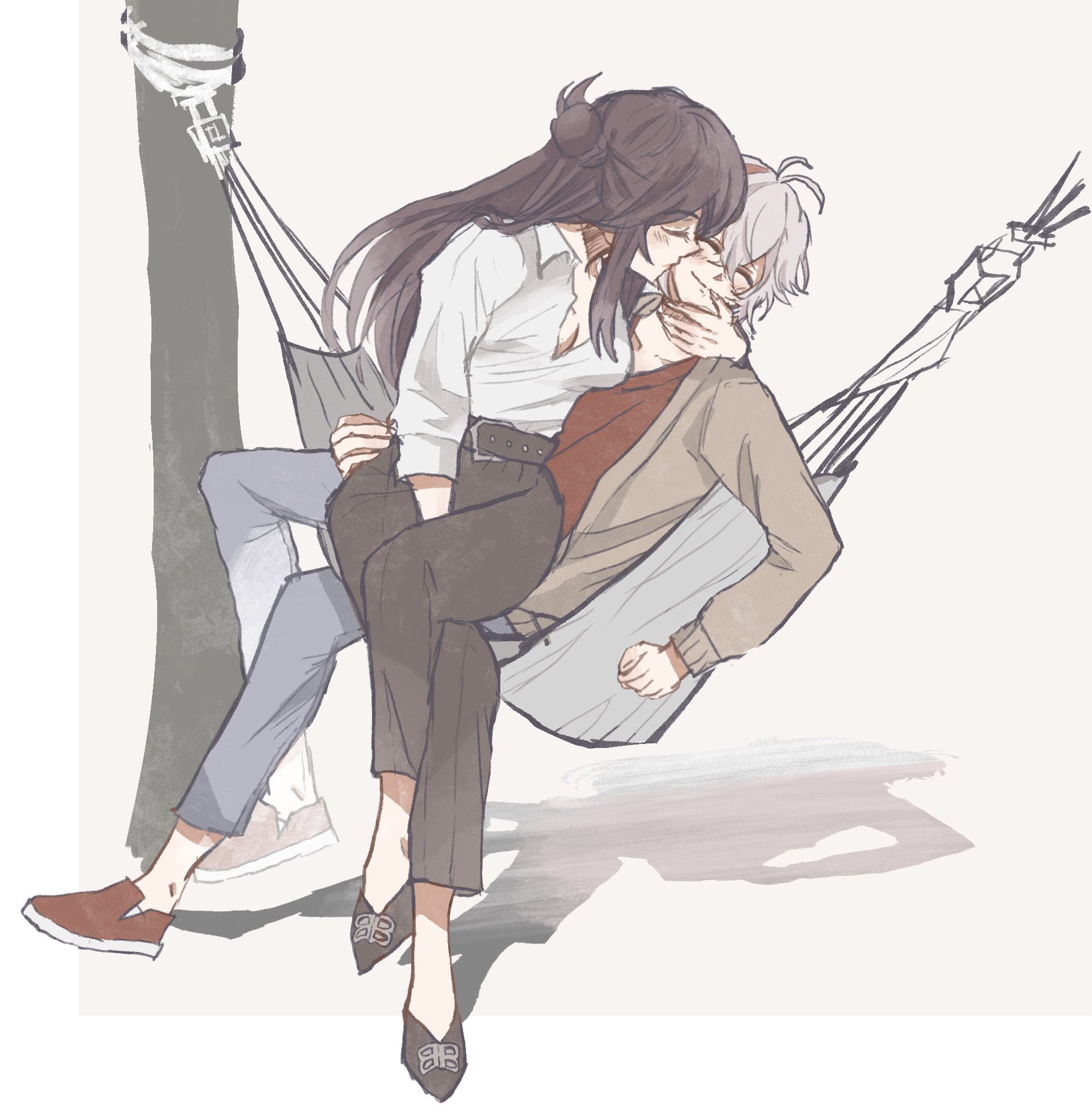 1boy 1girl beidou_(genshin_impact) brown_hair closed_eyes couple full_body genshin_impact hammock hetero highres kaedehara_kazuha kasep long_hair shirt short_hair sitting sitting_on_person tagme white_hair white_shirt