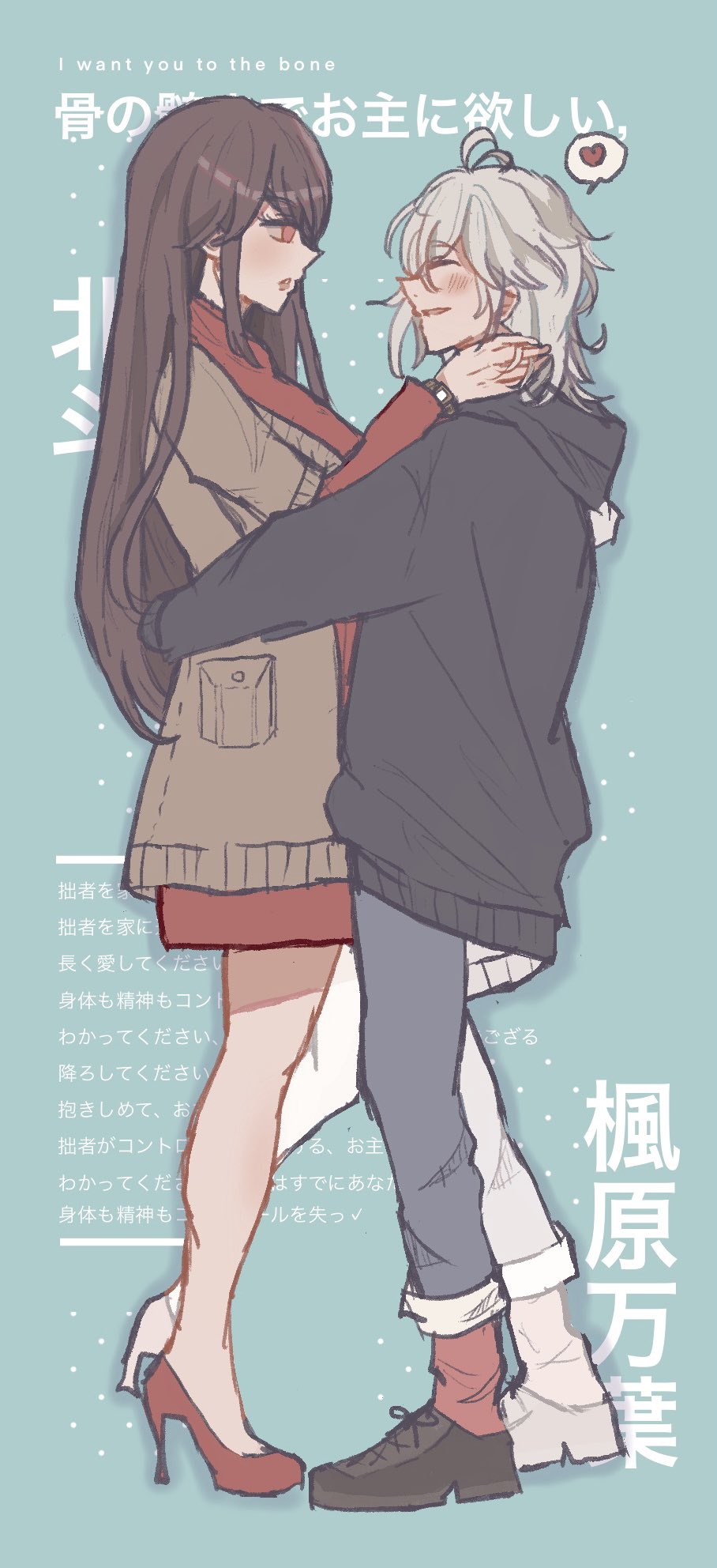 1boy 1girl ahoge alternate_costume beidou_(genshin_impact) blush couple english_text full_body genshin_impact heart hetero high_heels highres jacket kaedehara_kazuha kasep orange_eyes taller_female translation_request white_hair
