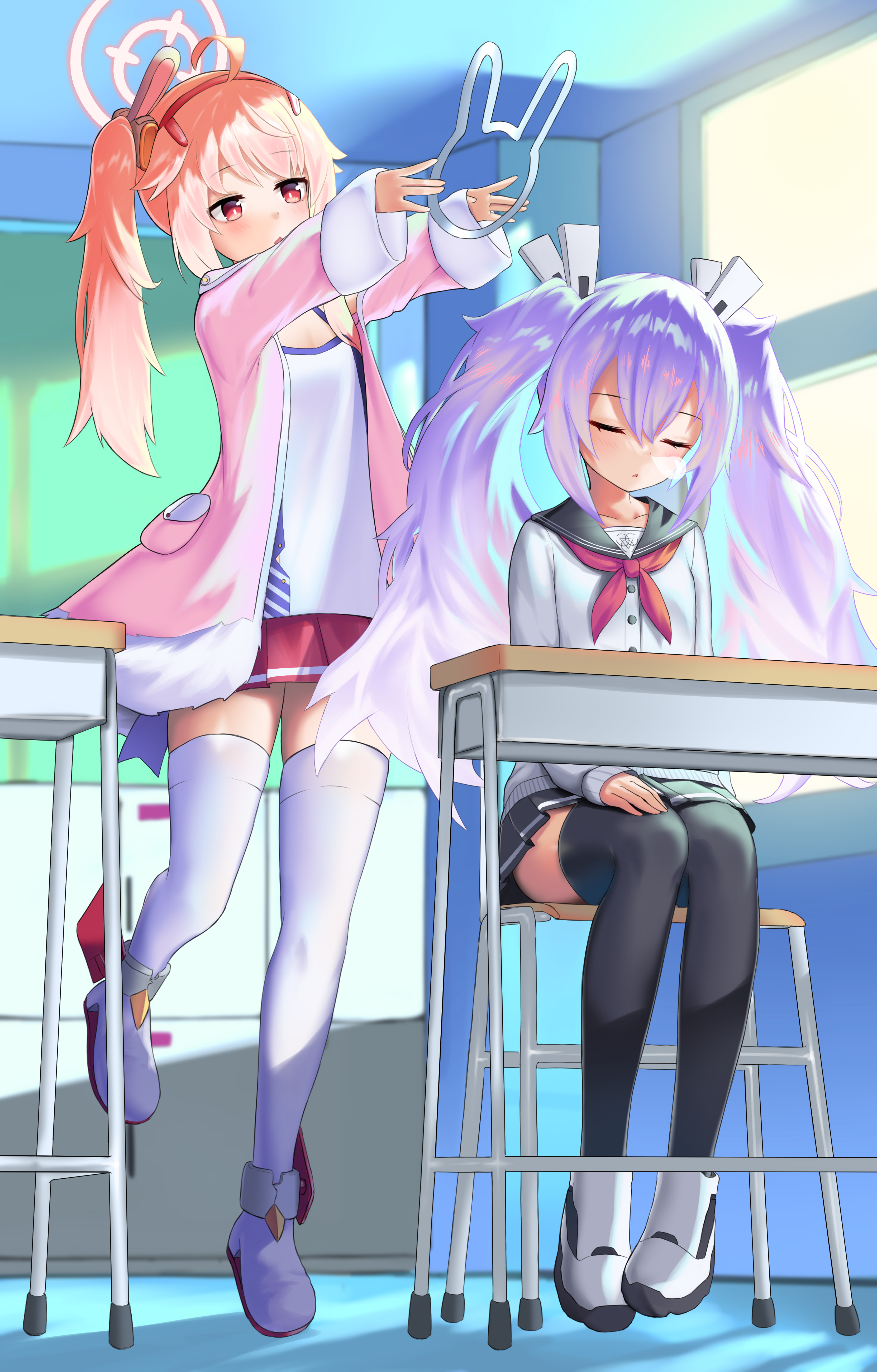 2girls absurdres animal_ears azur_lane black_skirt black_thighhighs blue_archive blurry chair chalkboard classroom collarbone commentary cosplay costume_switch depth_of_field desk fake_animal_ears full_body gradient_hair hair_between_eyes hair_ornament hairband halo head_tilt highres holding indoors jacket laffey_(azur_lane) laffey_(azur_lane)_(cosplay) long_hair long_sleeves looking_at_another multicolored_hair multiple_girls naganawa_maria natsu_(blue_archive) natsu_(blue_archive)_(cosplay) nose_bubble open_clothes open_jacket parted_lips pink_hair pink_jacket pleated_skirt purple_hair rabbit_ears red_eyes red_skirt school_chair school_desk school_uniform seori serafuku side_ponytail sidelocks sitting skirt sleeping standing standing_on_one_leg thighhighs triangle_mouth twintails voice_actor_connection white_thighhighs window zettai_ryouiki
