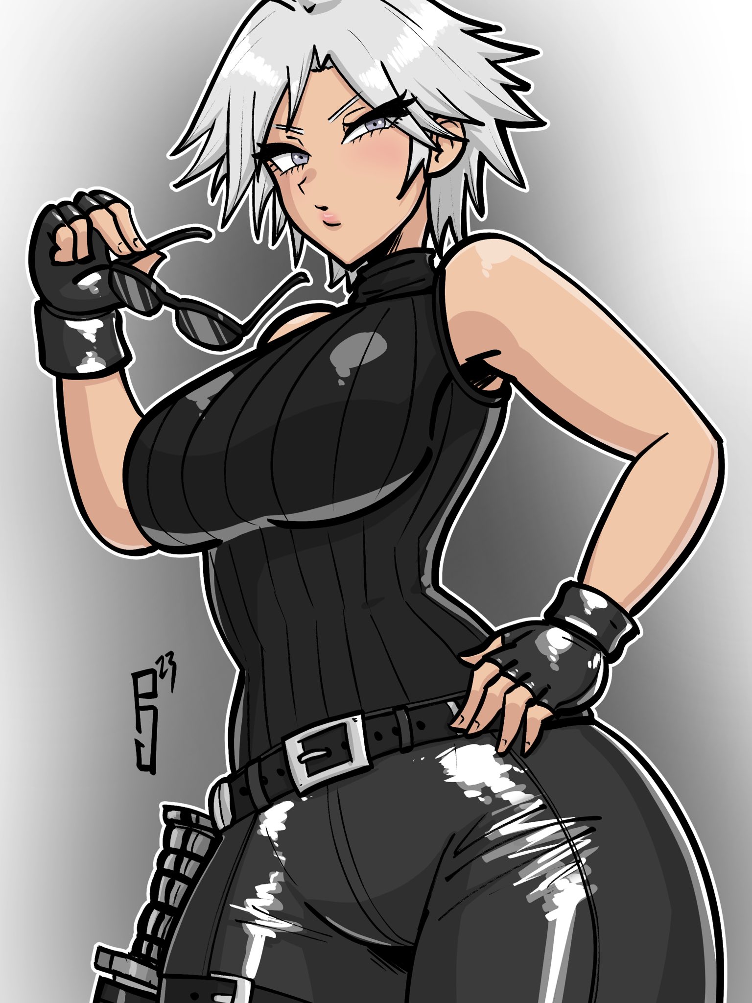 1girl bare_shoulders belt breasts christie_(doa) dead_or_alive fingerless_gloves gloves highres large_breasts paddy_g_(terrybrogard) pants short_hair sleeveless sunglasses sweater white_hair