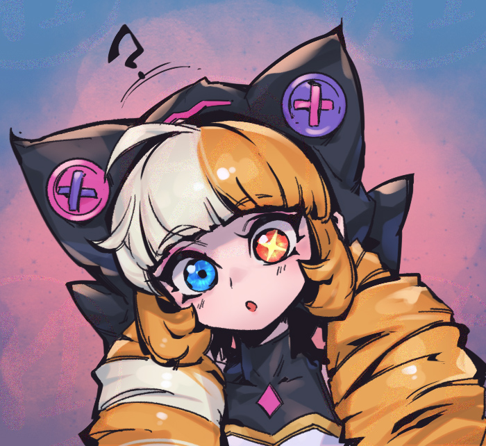 1girl :o ? animal_ears blue_eyes blunt_bangs brown_hair covered_collarbone fake_animal_ears gwen_(league_of_legends) hood hood_up league_of_legends looking_at_viewer multicolored_background official_alternate_costume phantom_cross portrait red_eyes solo soul_fighter_gwen white_hair