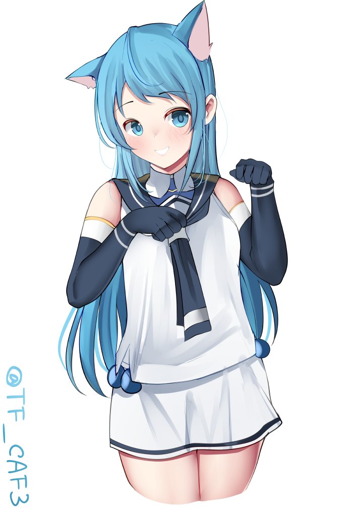 1girl animal_ears black_neckerchief blue_eyes blue_hair blush cat_ears cowboy_shot cropped_legs elbow_gloves extra_ears gloves gradient_hair kantai_collection long_hair looking_at_viewer multicolored_hair neckerchief sailor_collar samidare_(kancolle) school_uniform serafuku shirt skirt sleeveless sleeveless_shirt smile solo swept_bangs tf_cafe twitter_username very_long_hair white_serafuku