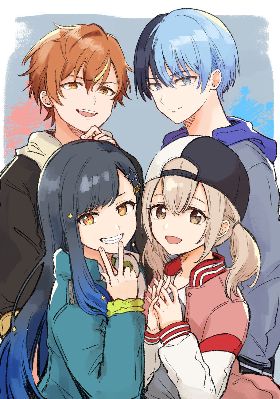 2boys 2girls aoyagi_touya azusawa_kohane baseball_cap black_hair blonde_hair blue_eyes blue_hair brown_eyes closed_mouth commentary_request dark_blue_hair fingernails gradient_hair hair_between_eyes hair_ornament hairclip hand_on_own_chin hand_up hands_up hat headphones headphones_around_neck highres hood hood_down hooded_jacket jacket light_brown_hair long_hair long_sleeves looking_at_viewer mizuyoshi mole mole_under_eye multicolored_hair multiple_boys multiple_girls open_clothes open_jacket open_mouth orange_eyes orange_hair partial_commentary project_sekai purple_hood shinonome_akito shiraishi_an short_hair short_twintails smile split-color_hair star_(symbol) star_hair_ornament streaked_hair teeth twintails two-tone_hair upper_body upper_teeth_only vivid_bad_squad_(project_sekai)