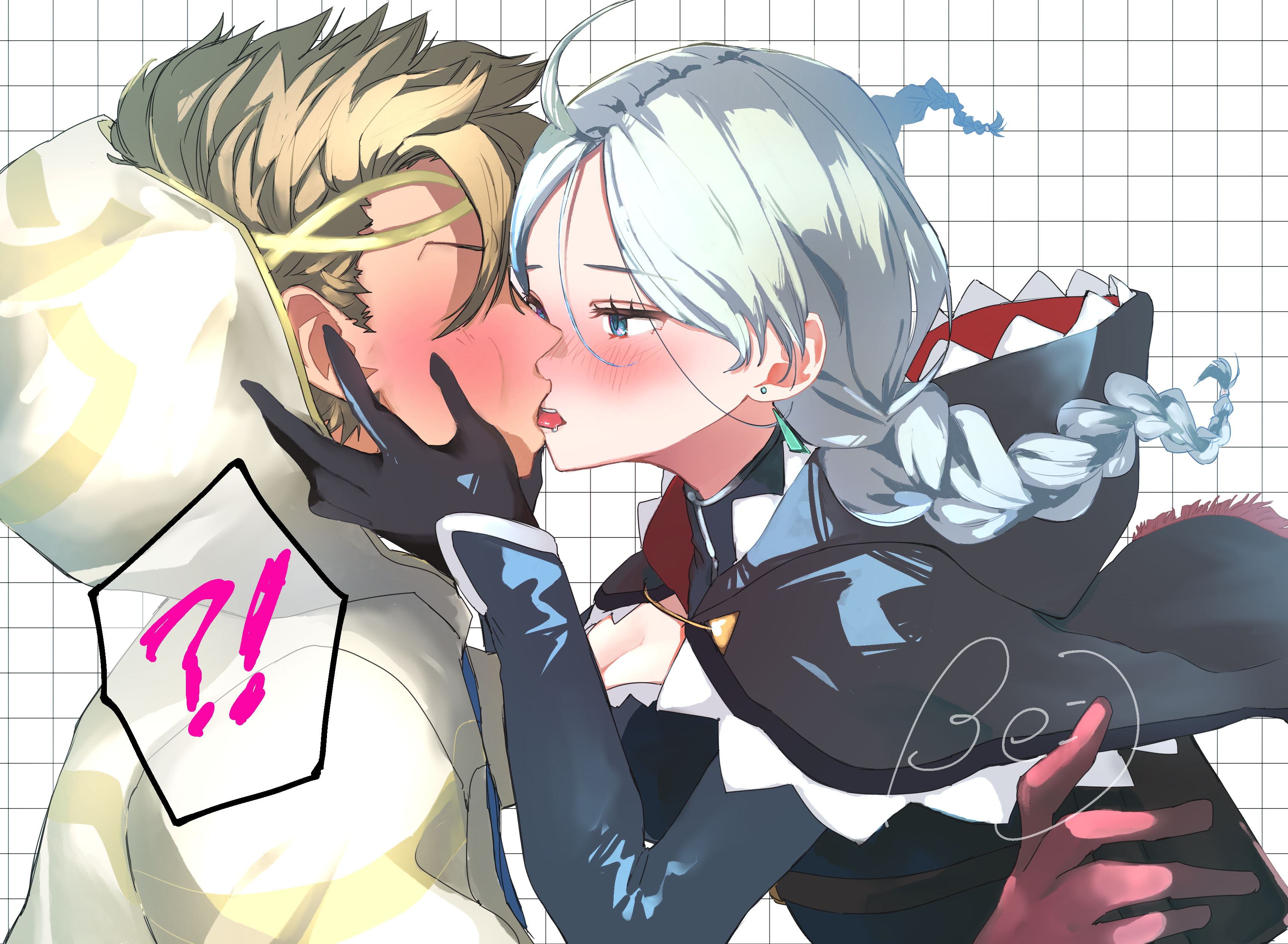 1boy 1girl absurdres ahoge blue_eyes blush braid commission commissioner_upload couple crystal_earrings earrings faceless faceless_male fire_emblem fire_emblem_fates fire_emblem_heroes hetero highres hood hood_down jewelry kiran_(fire_emblem) male_kiran_(fire_emblem) kiss low_twin_braids mayumayu024 nina_(fire_emblem) nina_(thief)_(fire_emblem) nintendo official_alternate_costume parted_bangs saliva skeb_commission surprise_kiss surprised tongue turtleneck twin_braids white_hair