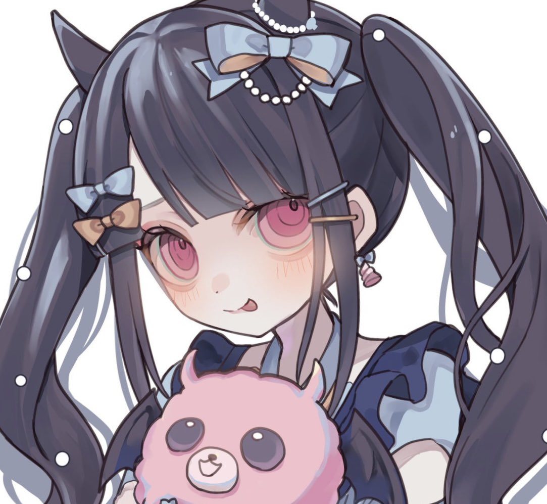 1girl alternate_costume black_hair blue_bow blunt_bangs blush bow closed_mouth commentary_request demon_horns demon_wings denonbu earrings hair_bow horns jewelry long_hair looking_at_viewer pink_eyes pomemori reml short_sleeves simple_background smile solo stuffed_toy tongue tongue_out twintails upper_body white_background wings yellow_bow yokubariyachii