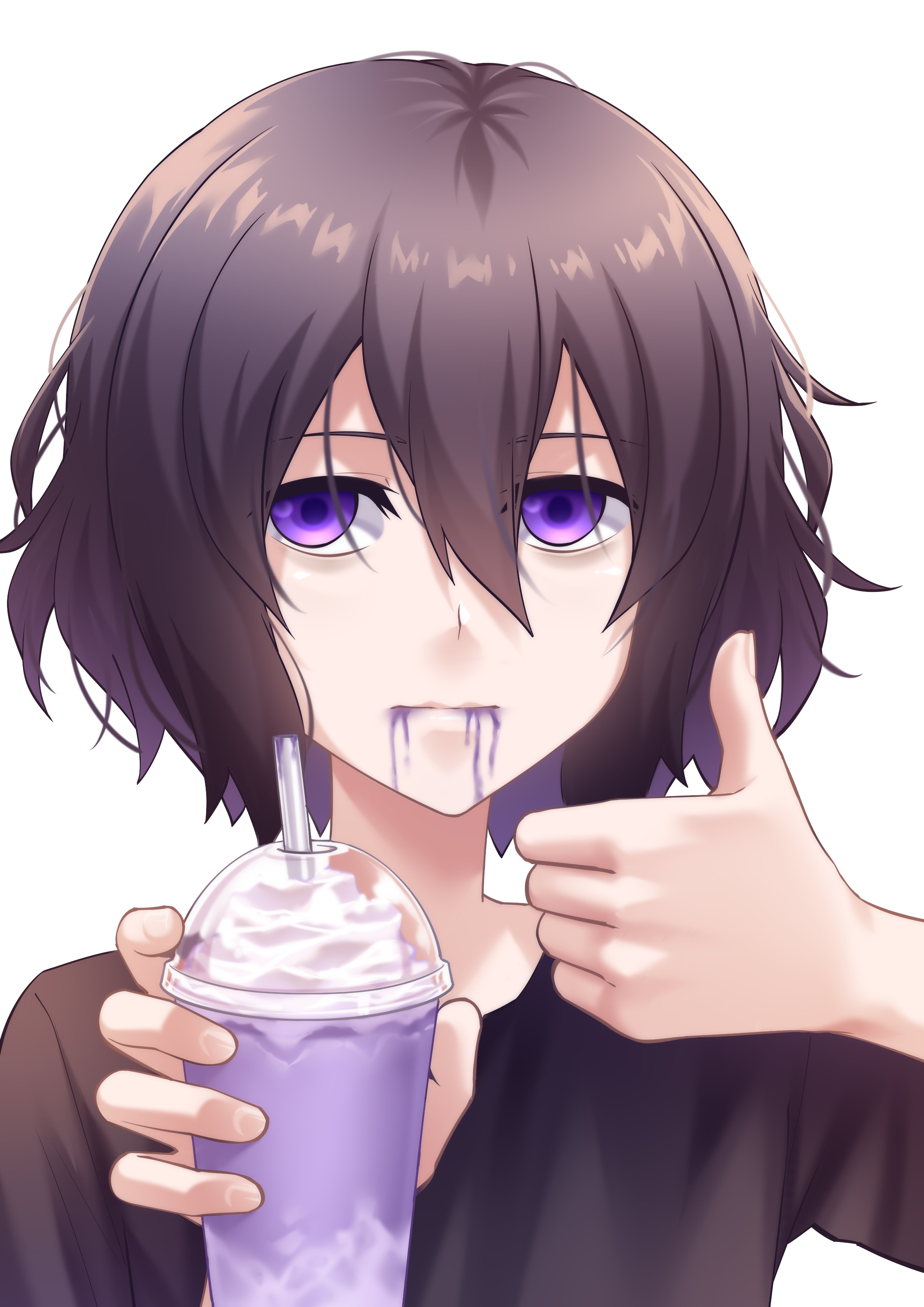 1girl absurdres black_shirt brown_hair closed_mouth cup grimace_shake_(meme) highres holding holding_cup levana_violette_(lusan666) lusan666 meme original purple_eyes shirt short_hair solo t-shirt thumbs_up white_background