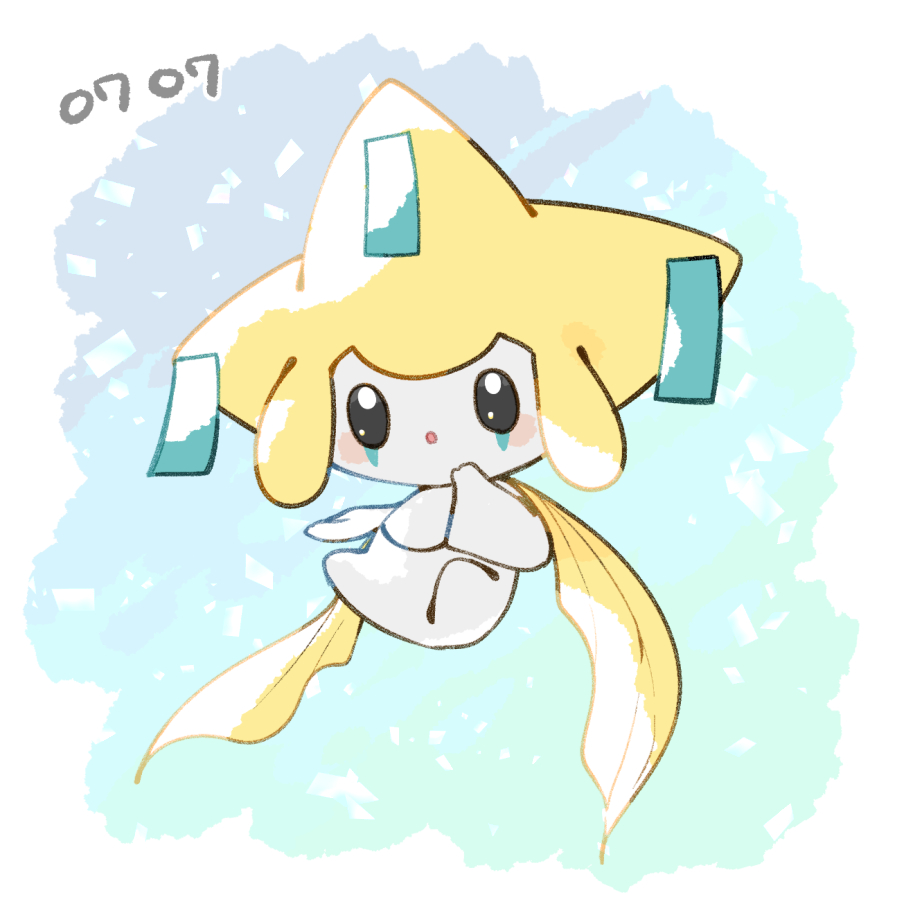 :o black_eyes blush_stickers border bright_pupils commentary_request full_body gen_3_pokemon hand_up jirachi kono2noko legendary_pokemon looking_at_viewer mythical_pokemon nintendo no_humans parted_lips pokemon pokemon_(creature) pokemon_focus solo white_border white_pupils