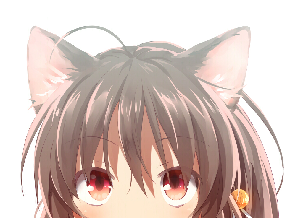 1girl ahoge animal_ear_fluff animal_ears ardbf bell blush brown_hair cat_ears cat_girl close-up commentary eyes_visible_through_hair hair_bell hair_between_eyes hair_ornament little_busters! long_hair natsume_rin red_eyes simple_background slit_pupils solo upturned_eyes white_background