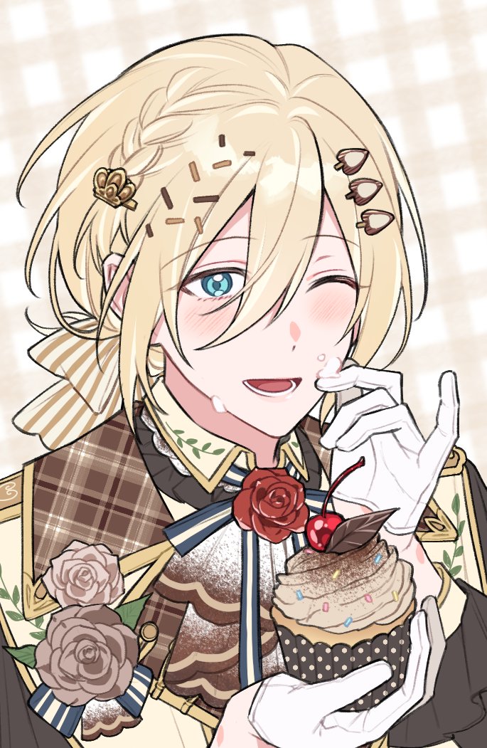 1boy alternate_costume bishounen black_shirt blonde_hair blue_eyes blush bow braid brown_flower brown_rose cupcake ear_piercing ensemble_stars! flower food gloves holding holding_food light_brown_background long_sleeves looking_at_viewer low_ponytail male_focus multicolored_background one_eye_closed open_mouth piercing pink_flower pink_rose ponytail rose shirt smile solo striped_bow teeth tenshouin_eichi vest white_background white_gloves white_vest xpstydlsrkddlcl