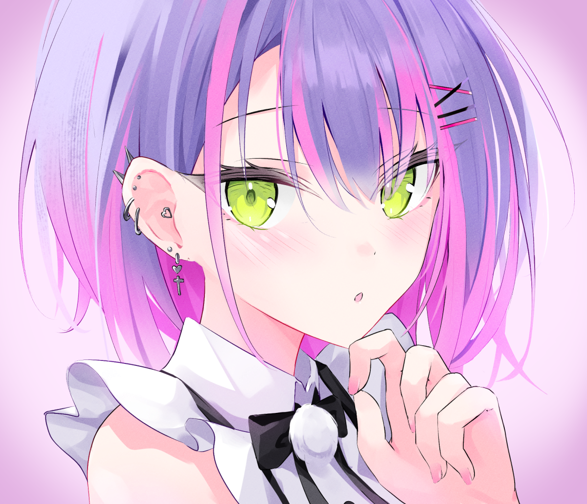 1girl black_bow black_bowtie blush bow bowtie colored_inner_hair commentary ear_piercing earrings frilled_shirt frills green_eyes hair_ornament hairclip hololive jewelry looking_at_viewer multicolored_hair multiple_piercings nerusu official_alternate_costume official_alternate_hair_length official_alternate_hairstyle parted_lips piercing pink_hair pom_pom_(clothes) portrait purple_hair shirt sleeveless sleeveless_shirt solo spike_piercing streaked_hair surprised untranslatable_commentary tokoyami_towa tokoyami_towa_(jirai_kei) virtual_youtuber white_shirt x_hair_ornament