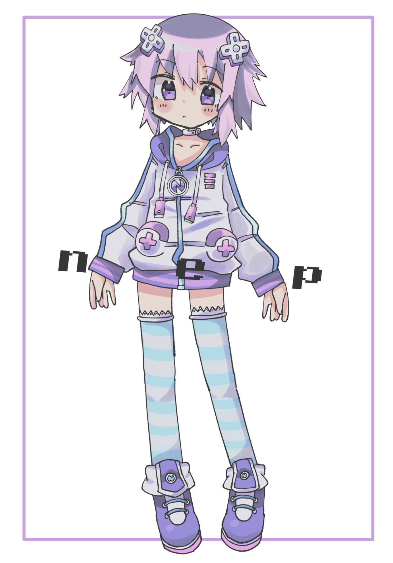1girl arms_at_sides blush character_name closed_mouth d-pad d-pad_hair_ornament drawstring enorari frown full_body hair_between_eyes hair_ornament highres hood hood_down hooded_jacket jacket jewelry legs_apart light_purple_hair long_sleeves neck_ring neptune_(neptunia) neptune_(series) purple_eyes purple_footwear short_hair solo standing striped_clothes striped_thighhighs thighhighs white_jacket zettai_ryouiki