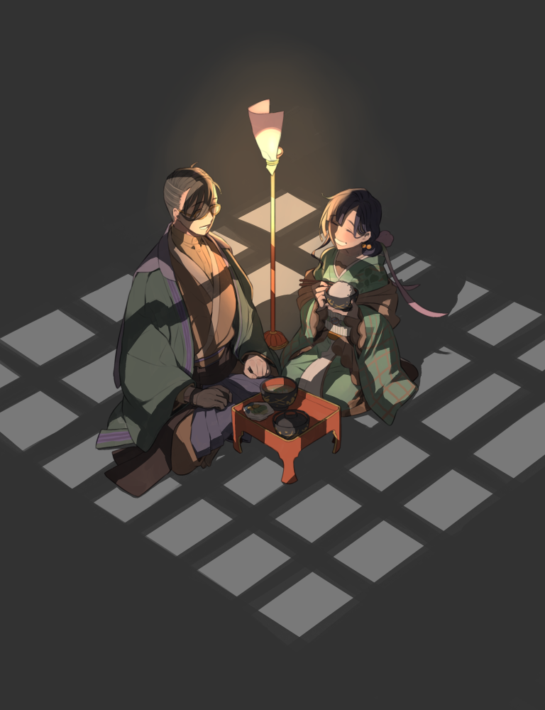 1boy 1girl :d ^_^ akesato_(fate) black_gloves black_hair blunt_bangs bowl brown_kimono brown_shawl brown_shirt chopsticks clenched_hands closed_eyes dress_shirt facing_another fate/grand_order fate_(series) full_body glasses gloves green_jacket green_kimono grey_background hair_bobbles hair_bun hair_ornament hair_over_one_eye hair_pulled_back hakama haori holding holding_bowl holding_chopsticks jacket japanese_clothes kimono lamp long_hair miso_soup ooba open_mouth parted_lips plate purple_hakama purple_ribbon ribbon rice_bowl seiza shadow shawl shirt short_hair single_glove single_hair_bun sitting smile tray window_shadow yamanami_keisuke_(fate)
