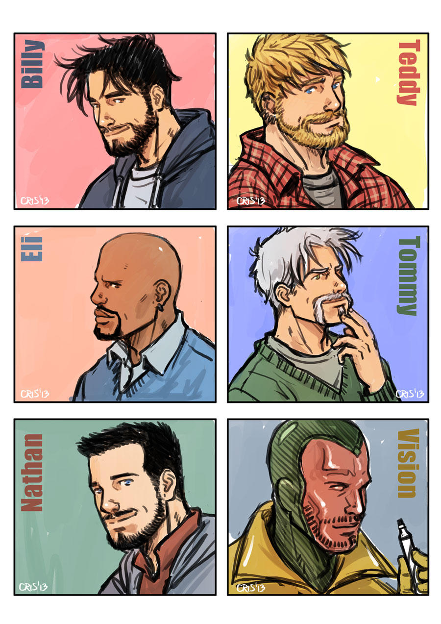 6+boys aged_up alternate_facial_hair bald bara beard black_hair blonde_hair blue_eyes character_request collared_shirt cris_art dark-skinned_male dark_skin ear_piercing facial_hair from_side goatee highres hulkling looking_at_viewer male_focus marvel mature_male multiple_boys mustache pectorals piercing portrait shirt short_hair smile stroking_beard thick_eyebrows tommy_shepherd vision_(marvel) white_hair wiccan