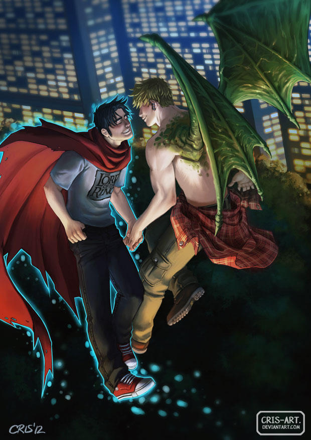2boys alien bara black_hair blonde_hair blush cityscape cloak clothes_around_waist couple cris_art dragon_wings flying from_side full_body green_wings grin half-closed_eyes happy hulkling imminent_kiss interspecies long_sideburns male_focus marvel multiple_boys pants red_cloak shirt shirt_around_waist shoes short_hair sideburns smile telekinesis thick_eyebrows toned toned_male topless_male wiccan wings yaoi