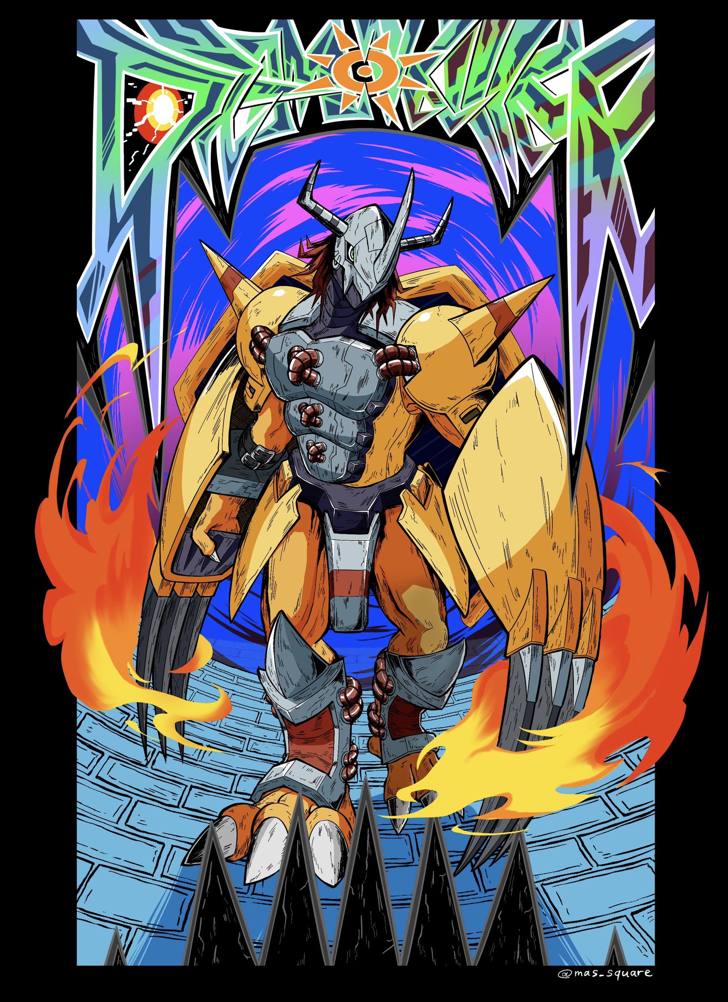 armor claws digimon digimon_(creature) digimon_adventure full_body green_eyes helmet highres horns mas_square multicolored_background no_humans red_hair solo standing wargreymon