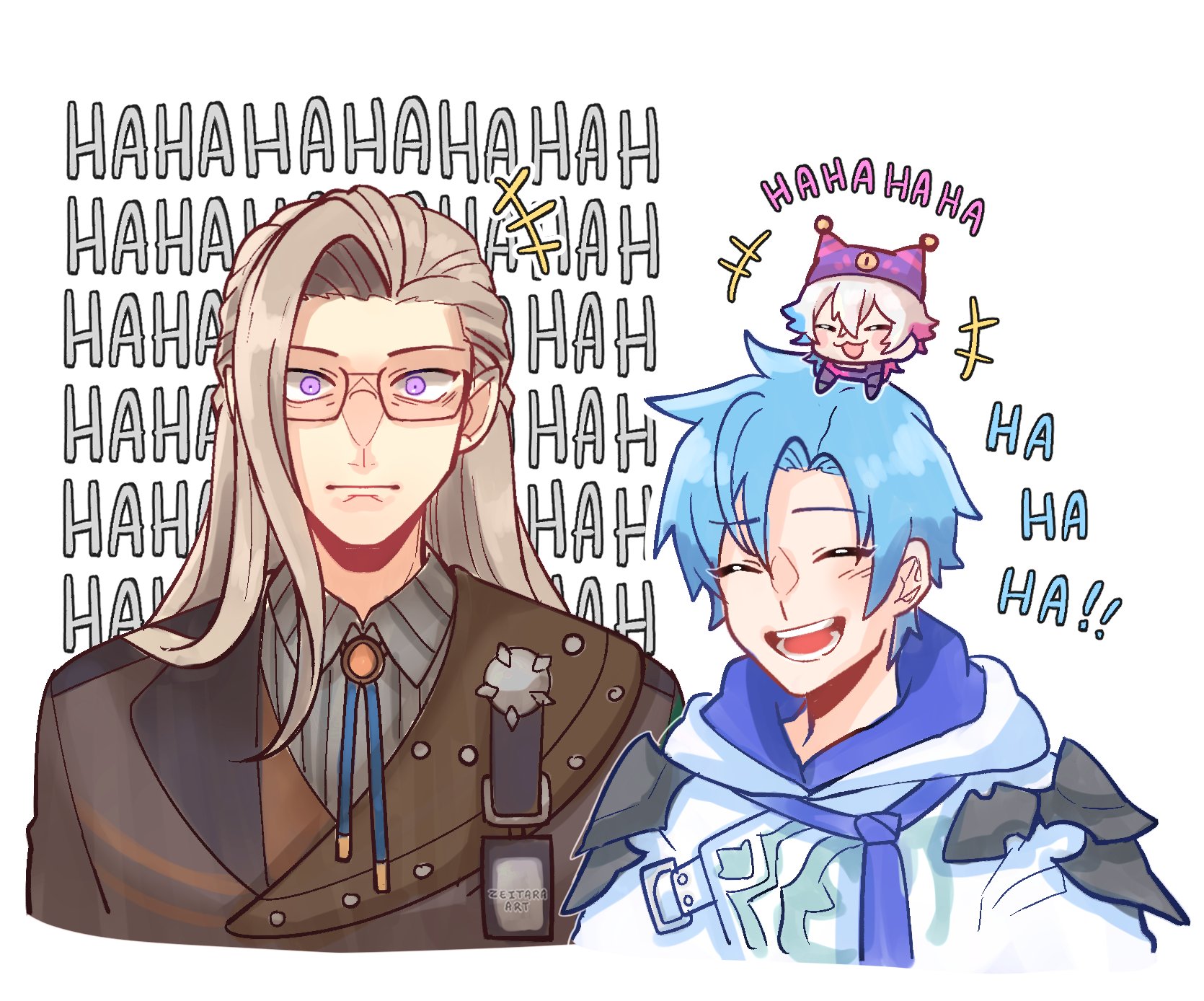 3boys blue_hair english_text gavis_bettel glasses grey_hair highres holostars holostars_english jacket laughing long_hair multicolored_hair multiple_boys noir_vesper noir_vesper_(1st_costume) pink_hair pointy_ears purple_eyes regis_altare shirt short_hair smile virtual_youtuber white_background zeitaraart