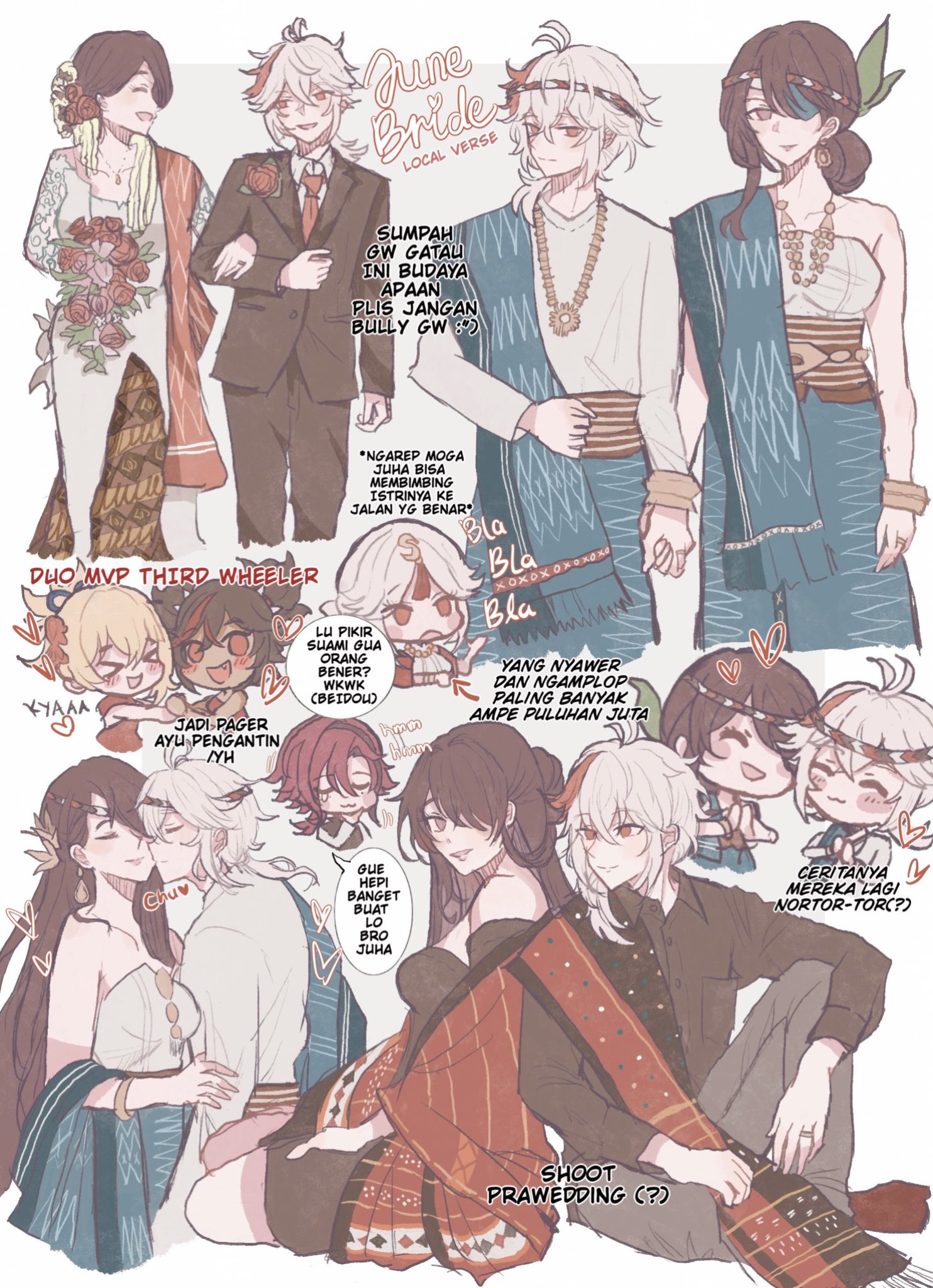 2boys 4girls beidou_(genshin_impact) brown_hair chibi couple eyepatch genshin_impact hair_over_one_eye hetero highres indonesian_clothes indonesian_text kaedehara_kazuha kasep long_hair multiple_boys multiple_girls ningguang_(genshin_impact) red_hair shikanoin_heizou short_hair speech_bubble tagme white_hair xinyan_(genshin_impact) yoimiya_(genshin_impact)