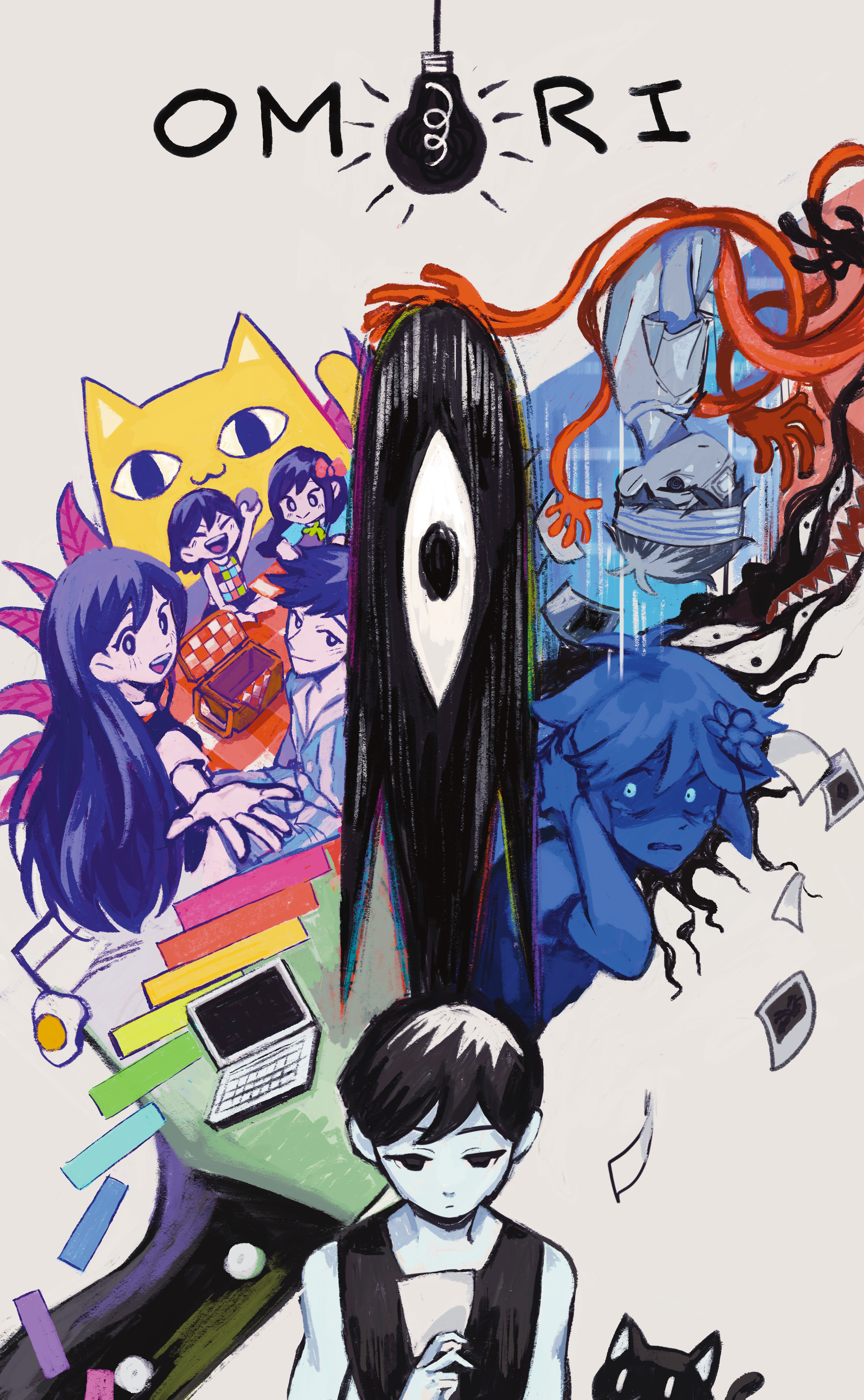 2girls 5boys absurdres aubrey_(headspace)_(omori) aubrey_(omori) basil_(headspace)_(omori) basil_(omori) big_yellow_cat_(omori) black_eyes black_hair bow closed_eyes closed_mouth colored_skin copyright_name eyepatch flower fried_egg hair_bow hair_flower hair_ornament hero_(headspace)_(omori) hero_(omori) highres hospital_gown joylychi kel_(headspace)_(omori) kel_(omori) light_bulb long_hair mari_(headspace)_(omori) mari_(omori) multiple_boys multiple_girls omori omori_(omori) pet_rock pink_bow purple_eyes purple_hair short_hair something_(omori) spoilers sunny_(hospital_gown)_(omori) sunny_(omori) white_skin