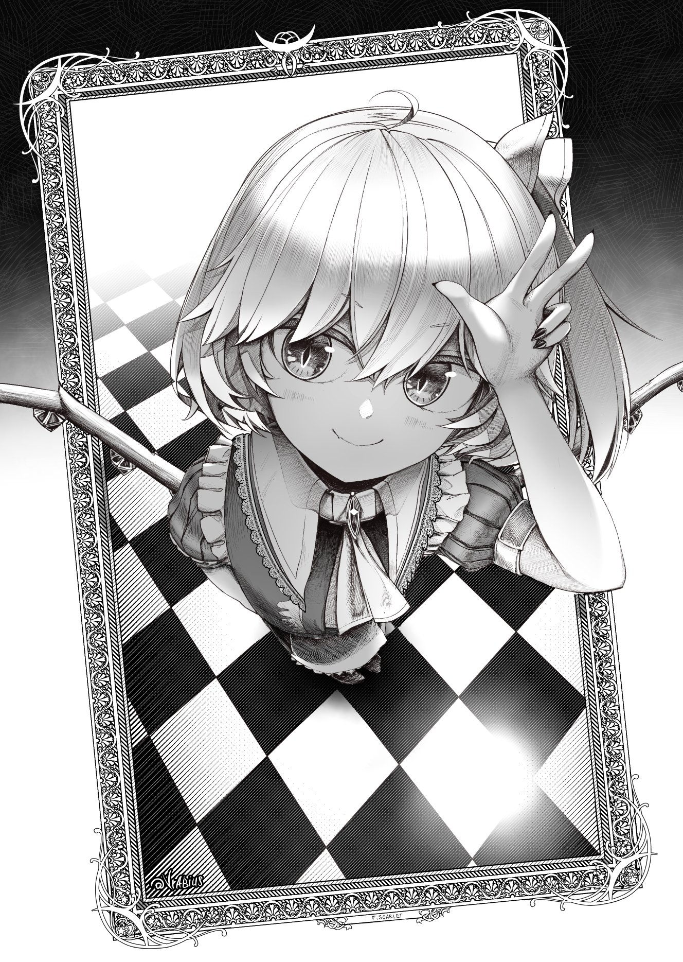 1girl checkered_floor closed_mouth commentary crystal english_commentary flandre_scarlet foreshortening full_body greyscale highres looking_at_viewer monochrome one_side_up red_eyes short_hair smile solo touhou twitter_username vrabius w wings