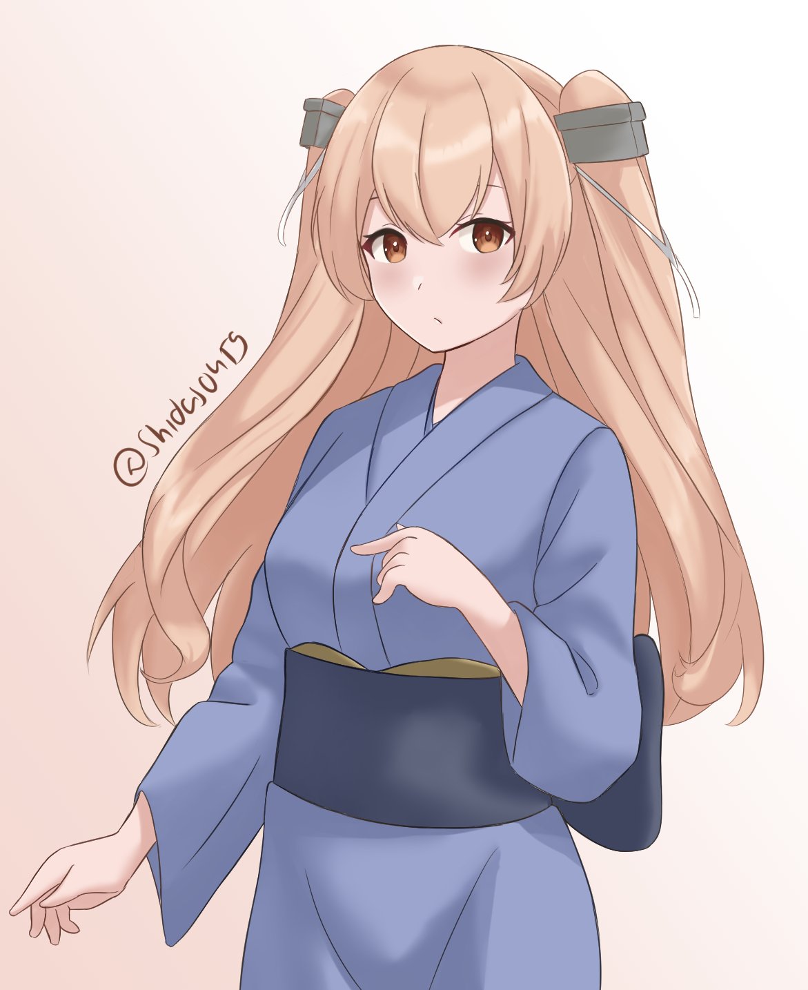 1girl blue_kimono breasts brown_eyes brown_hair closed_mouth commentary_request cowboy_shot gradient_background hair_between_eyes hair_ornament highres japanese_clothes johnston_(kancolle) kantai_collection kimono light_blush long_hair long_sleeves looking_at_viewer medium_breasts mixed-language_commentary obi one-hour_drawing_challenge sash shidas0459 solo twitter_username two_side_up