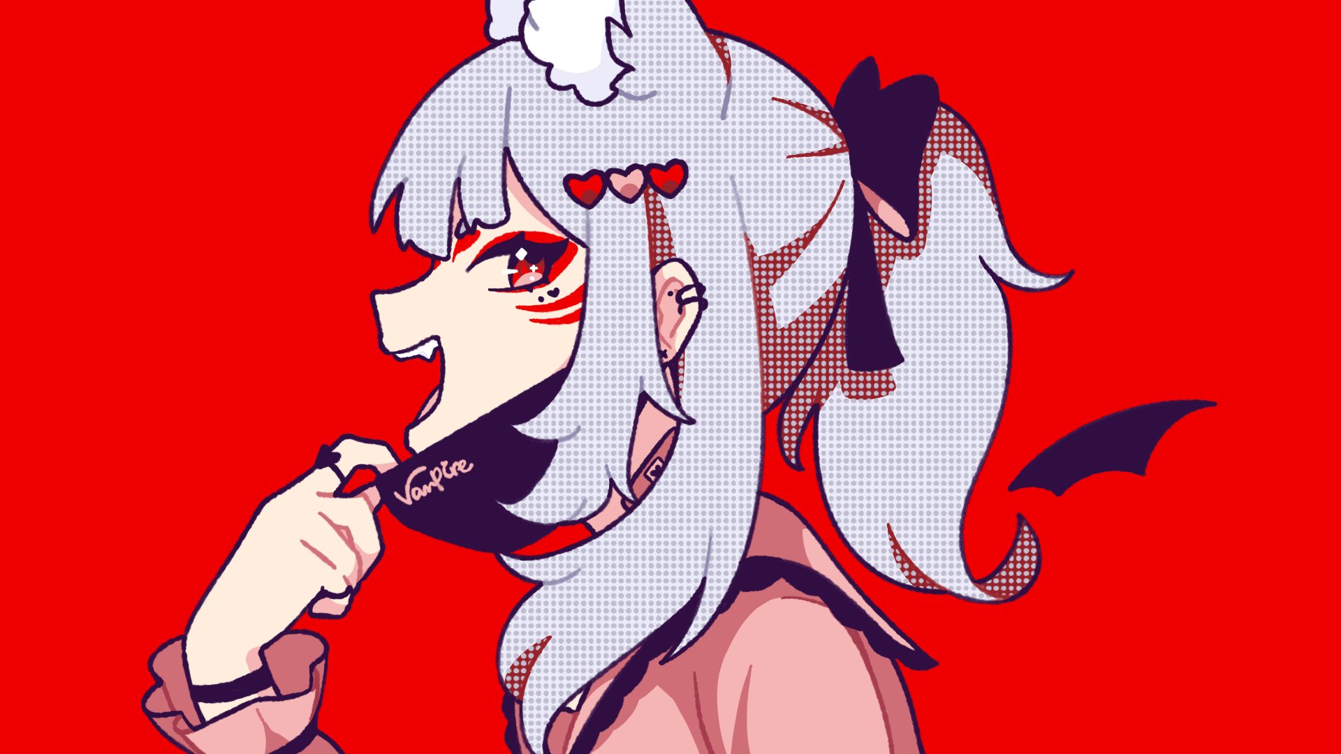 animal_ears bandaid ethyria eyeliner eyeshadow facial_mark forehead_mark fox_ears fox_girl highres hyuni_(hyunicat) makeup nijisanji nijisanji_en nina_kosaka ponytail red_background red_eyeliner red_eyeshadow ribbon sharp_teeth teeth vampire virtual_youtuber