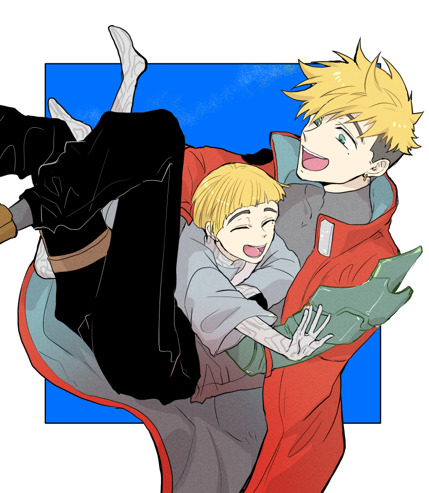 2boys :d ^_^ age_comparison black_hair black_pants black_shirt blonde_hair blue_background blue_eyes blunt_bangs closed_eyes coat feet_out_of_frame full_body grey_shirt holster knees_up looking_at_another meltdown0802 mole mole_under_eye multiple_boys open_mouth pants prosthesis prosthetic_arm red_coat shirt short_hair smile thigh_holster trigun trigun_stampede undercut vash_the_stampede white_background wide_sleeves