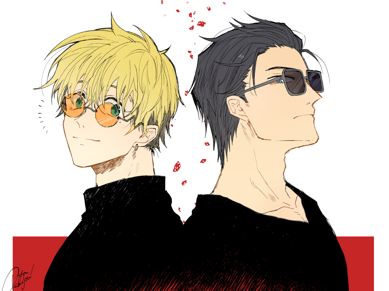 2boys black_eyes black_hair black_shirt blonde_hair closed_mouth collarbone earrings glasses hair_slicked_back jewelry looking_at_viewer male_focus meltdown0802 mole mole_under_eye multiple_boys orange-tinted_eyewear round_eyewear shirt short_hair single_earring smile sunglasses tinted_eyewear trigun trigun_stampede upper_body vash_the_stampede white_background