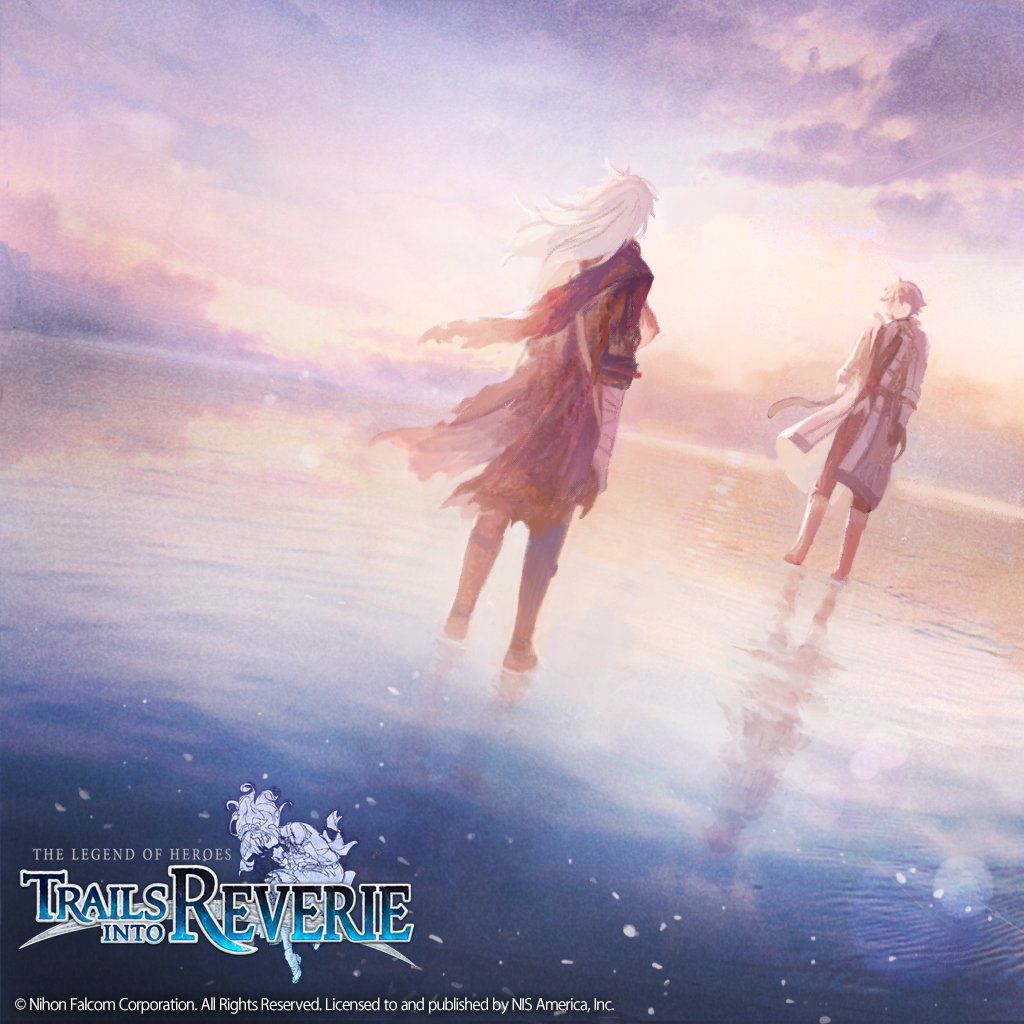 2boys bandaged_arm bandaged_hand bandages black_hair boots cloud coat commentary eiyuu_densetsu english_commentary hajimari_no_kiseki ishmelga_rean logo long_hair multiple_boys official_art on_water outdoors rean_schwarzer scarf short_hair sky standing standing_on_liquid torn_clothes torn_scarf water white_hair wolfyinthecity