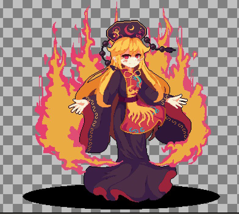 1girl black_dress checkered_background closed_mouth dress full_body grey_background headdress junko_(touhou) kaaaarin legacy_of_lunatic_kingdom long_hair long_sleeves looking_at_viewer orange_hair pixel_art red_eyes solo tabard tassel touhou wide_sleeves