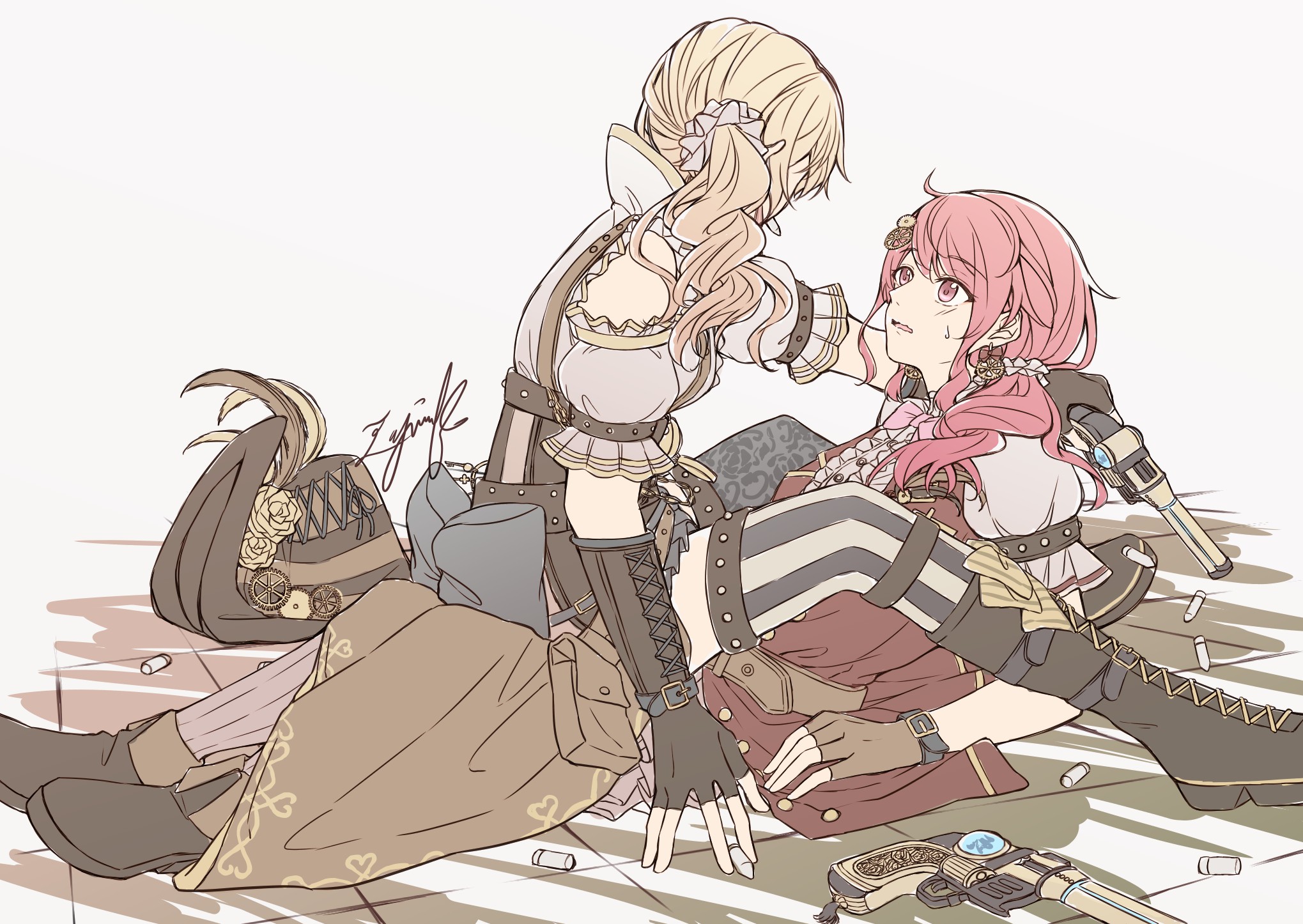 2girls ahoge aiiro_bokujuu arm_support asymmetrical_legwear bang_dream! bang_dream!_girls_band_party! black_gloves blonde_hair blush boots brown_footwear brown_gloves chinese_commentary commentary_request corset earrings elbow_gloves fingerless_gloves full_body gloves gun handgun highres holding holding_gun holding_weapon jewelry maruyama_aya mismatched_legwear multiple_girls pink_eyes pink_hair pleated_skirt puffy_sleeves revolver shell_casing shirasagi_chisato short_sleeves side_ponytail sidelocks simple_background skirt sleeveless striped_clothes striped_thighhighs sweatdrop thighhighs wavy_mouth weapon white_background yuri