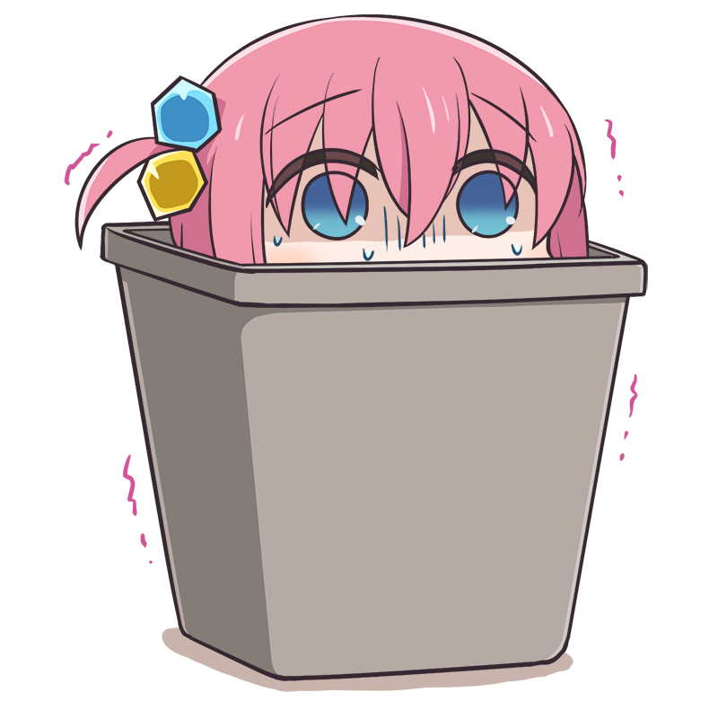 1girl blue_eyes bocchi_the_rock! cube_hair_ornament denden empty_eyes gloom_(expression) gotoh_hitori hair_between_eyes hair_ornament in_container in_trash_can motion_lines one_side_up pink_hair shaded_face simple_background solo sweat tareme transparent_background trash_can trembling