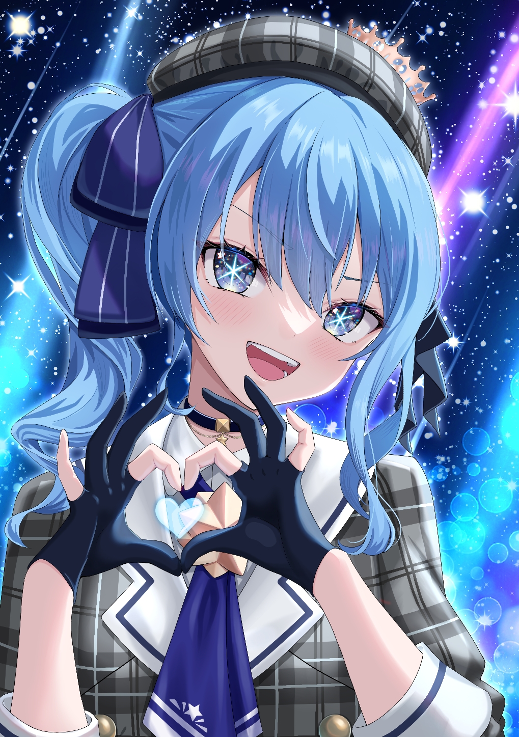 1girl :d ascot beret black_choker black_gloves blue_ascot blue_eyes blue_hair blush choker gloves grey_hat hair_between_eyes hat highres hololive hoshimachi_suisei hoshimachi_suisei_(1st_costume) idol kotone_neruneru long_hair one_side_up open_mouth oshi_no_ko partially_fingerless_gloves plaid_clothes plaid_hat plaid_shirt shirt sidelocks sky smile solo sparkle star-shaped_pupils star_(sky) star_(symbol) starry_sky symbol-shaped_pupils teeth upper_body virtual_youtuber