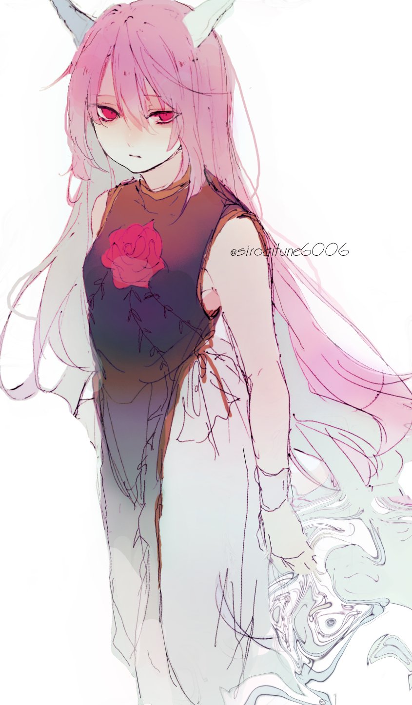 1girl bare_shoulders breasts carnation closed_mouth dress expressionless flower from_above gold_trim highres ibaraki_douji_(touhou) ibaraki_kasen kn001215 long_hair looking_at_viewer medium_breasts pink_eyes pink_hair simple_background solo tabard touhou twitter_username very_long_hair white_background white_dress