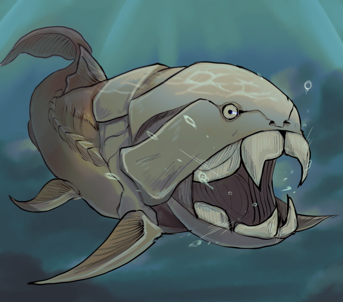 air_bubble animal_focus bubble dunkleosteus fish makita_(mugitya3776) no_humans open_mouth original sharp_teeth teeth underwater