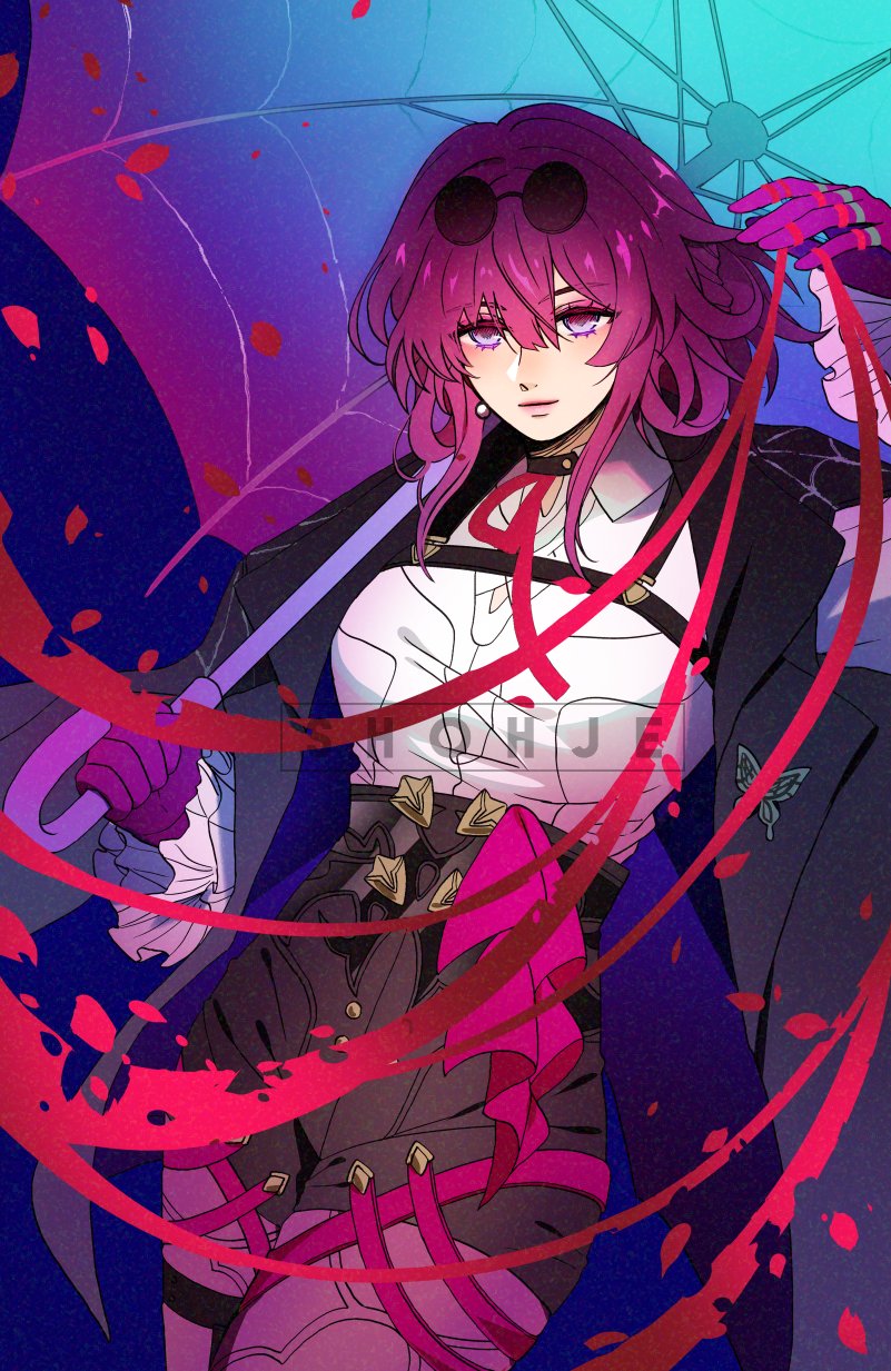 1girl black_choker black_jacket black_skirt blood blue_background choker closed_mouth earrings eyewear_on_head gloves highres honkai:_star_rail honkai_(series) jacket jacket_on_shoulders jewelry kafka_(honkai:_star_rail) leggings looking_at_viewer pearl_earrings petals pink_gloves pink_hair pink_leggings purple_eyes shirt shohje skirt smile solo string string_of_fate sunglasses umbrella white_shirt