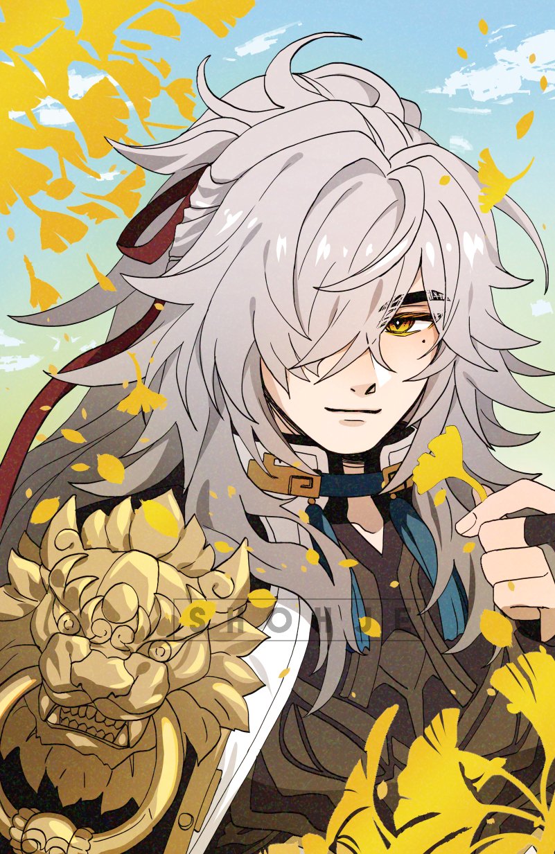 1boy artist_name blue_sky chinese_clothes closed_mouth grey_hair hair_over_one_eye high_ponytail highres holding holding_leaf honkai:_star_rail honkai_(series) jing_yuan leaf looking_at_viewer male_focus mole mole_under_eye one_eye_covered ponytail shohje sky smile solo yellow_eyes
