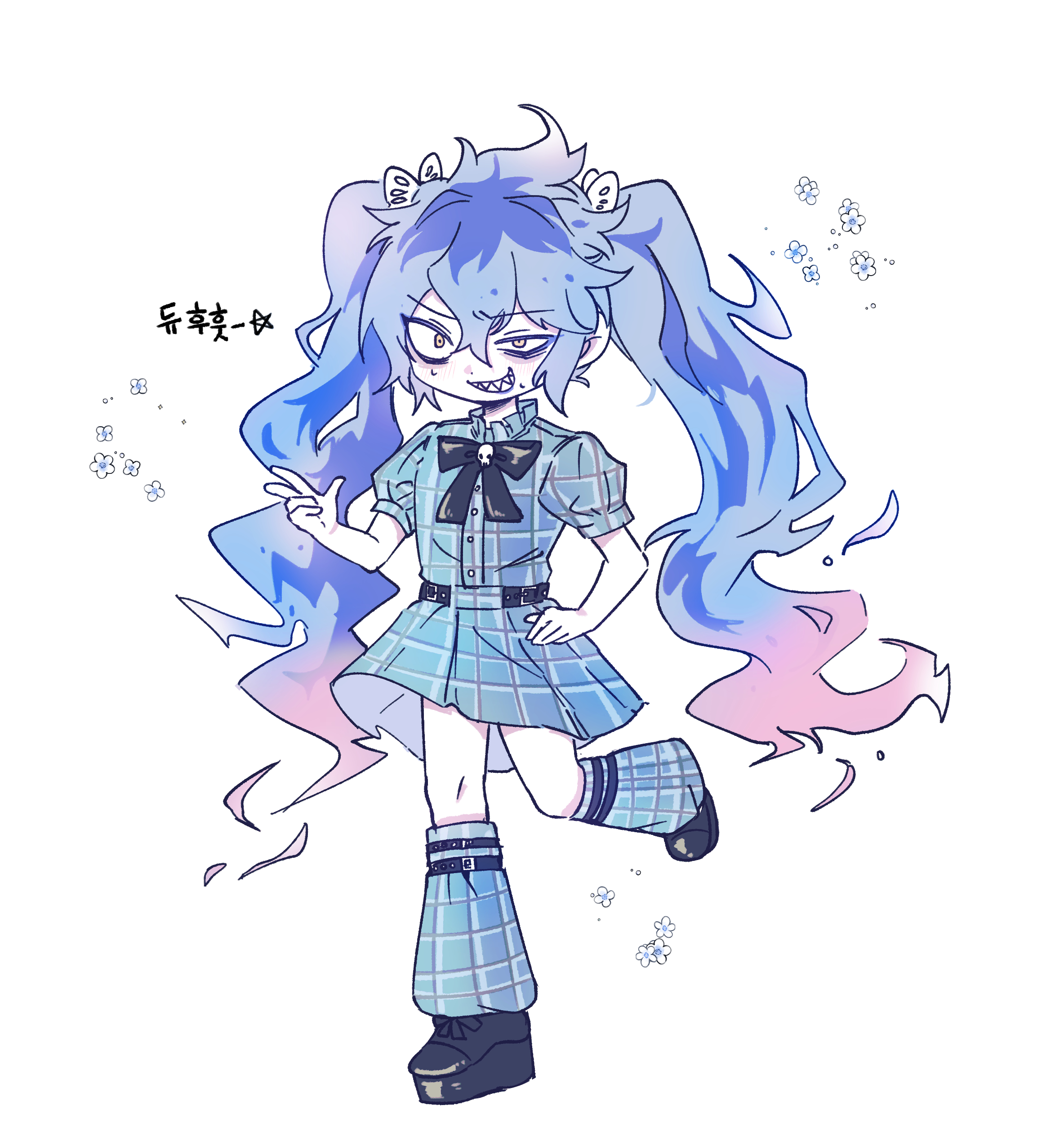 1boy absurdres bags_under_eyes black_bow black_footwear blue_eyeliner blue_hair blue_lips bow butterfly_hair_ornament crossdressing crossdressing_(mtf) eyeliner full_body gradient_hair grin hair_ornament highres idia_shroud korean_text leg_warmers makeup male_focus multicolored_hair plaid_clothes plaid_leg_warmers plaid_shirt plaid_skirt puffy_short_sleeves puffy_sleeves sharp_teeth shirt short_sleeves simple_background skirt skull_ornament smile solo sweatdrop teeth translation_request twintails twisted_wonderland uko02200 v white_background yellow_eyes
