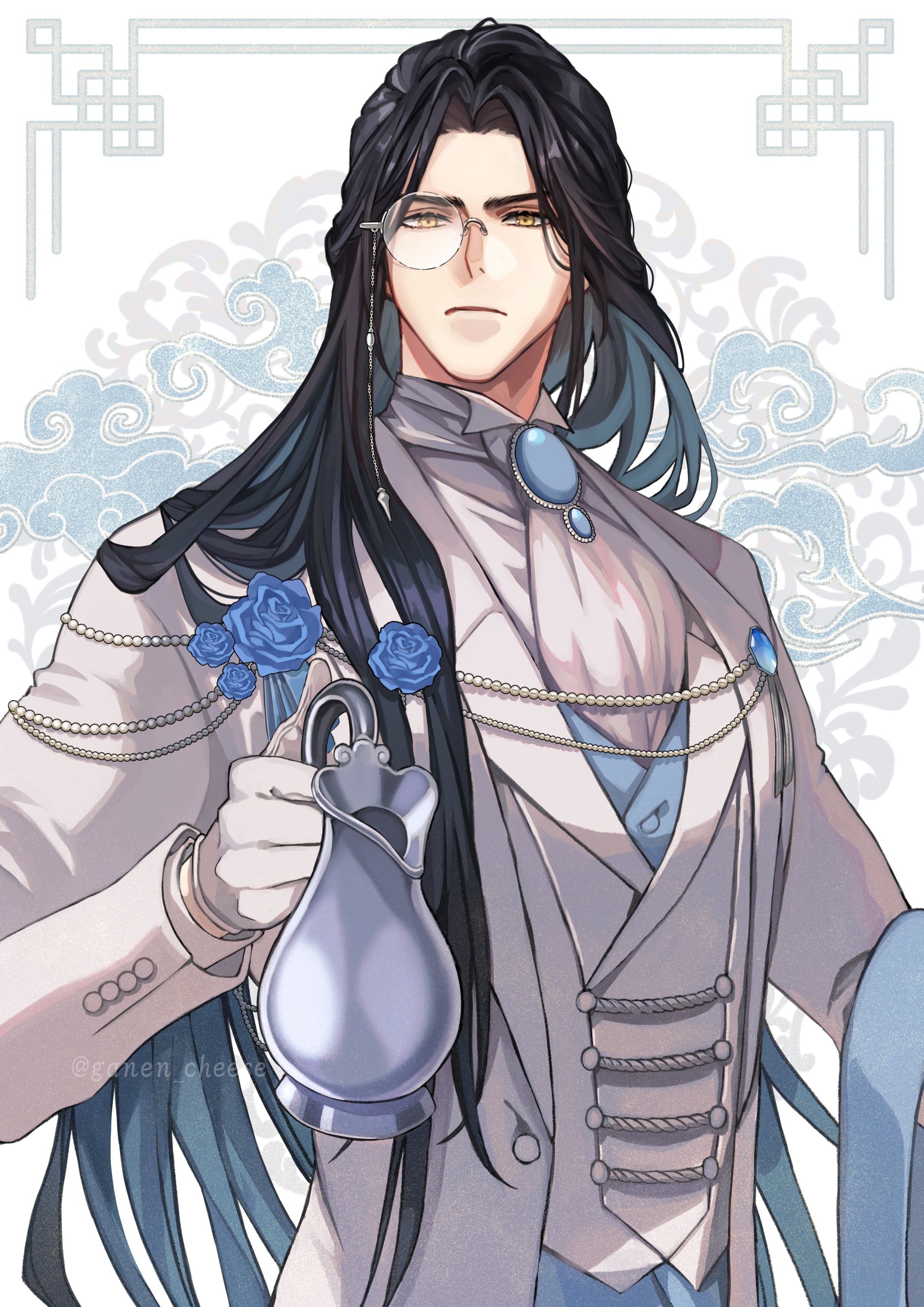 1boy absurdres artist_name beads black_hair blue_flower blue_gem blue_rose blue_shirt brooch buttons closed_mouth coat collared_shirt commentary_request eyewear_strap flower formal_clothes frown ganen_cheese gem gloves hand_up highres holding_pitcher jacket jewelry lan_wangji lapels layered_sleeves long_hair long_sleeves looking_at_viewer male_focus modao_zushi monocle necktie open_clothes open_coat parted_bangs pitcher_(container) rose serious shirt sidelocks simple_background solo twitter_username upper_body very_long_hair white_background white_coat white_gloves white_jacket white_necktie white_shirt xiangyun yellow_eyes