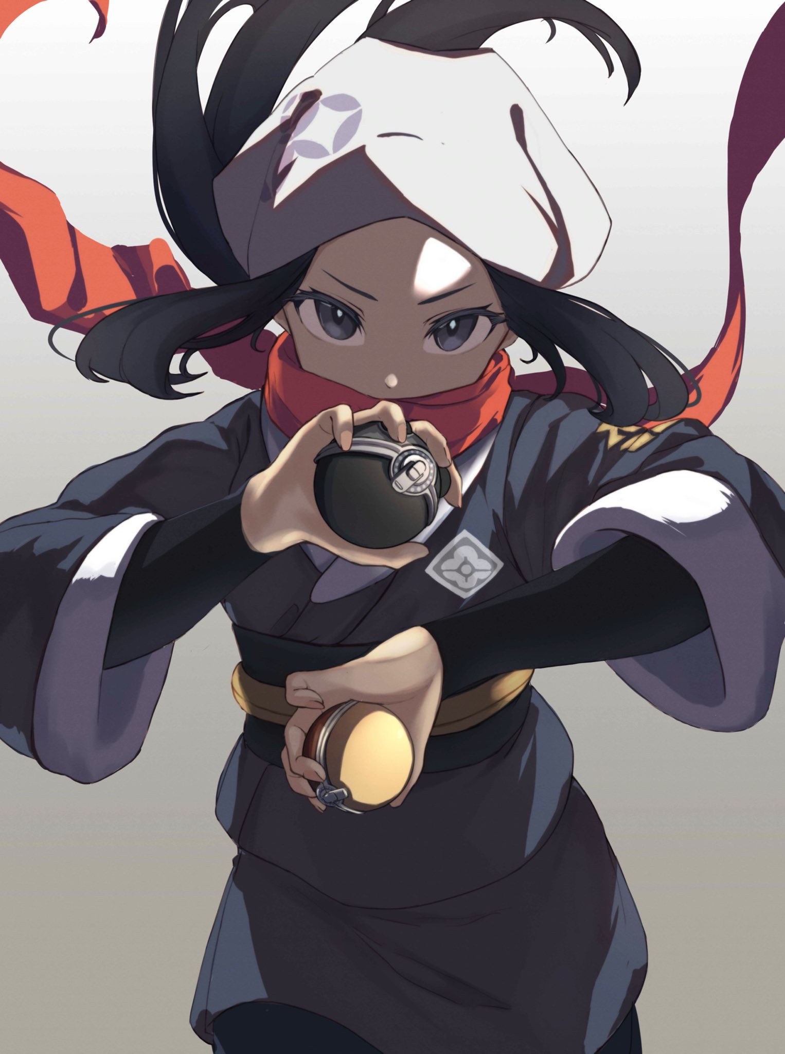 1girl akari_(pokemon) black_hair black_sash black_shirt commentary_request eyelashes floating_hair floating_scarf gradient_background grey_eyes grey_jacket grey_skirt hands_up headscarf highres hisuian_poke_ball holding holding_poke_ball jacket long_hair nintendo pantyhose poke_ball pokemon pokemon_legends:_arceus roka_(o-yasumi) sash scarf scarf_over_mouth shirt sidelocks skirt solo white_headscarf white_headwear